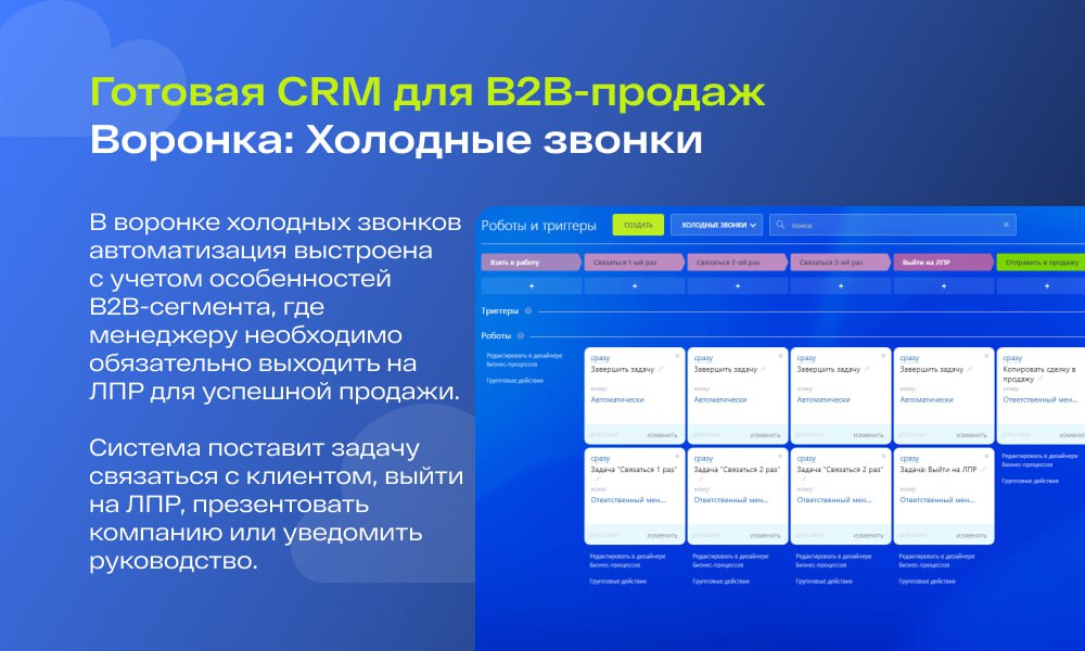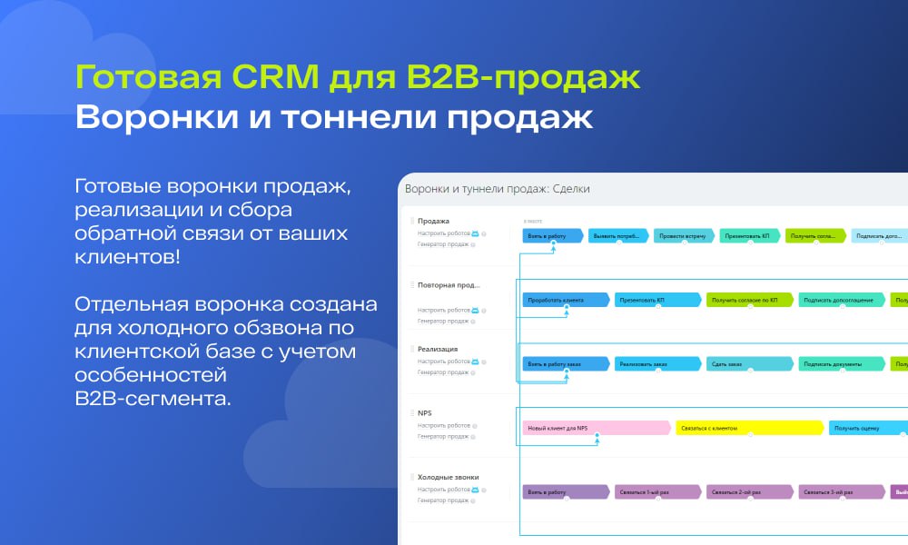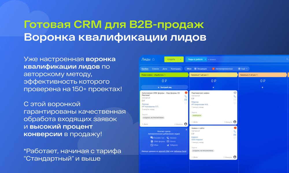 Наша готовая и настроенная CRM-система для B2B-продаж — это идеальное решение для вашего бизнеса. Мы предлагаем уникальную авторскую воронку квалификации лидов, эффективность которой была проверена на более чем 150 проектах. Эта воронка позволяет эффективно управлять процессом привлечения и конвертации потенциальных клиентов в реальных покупателей.