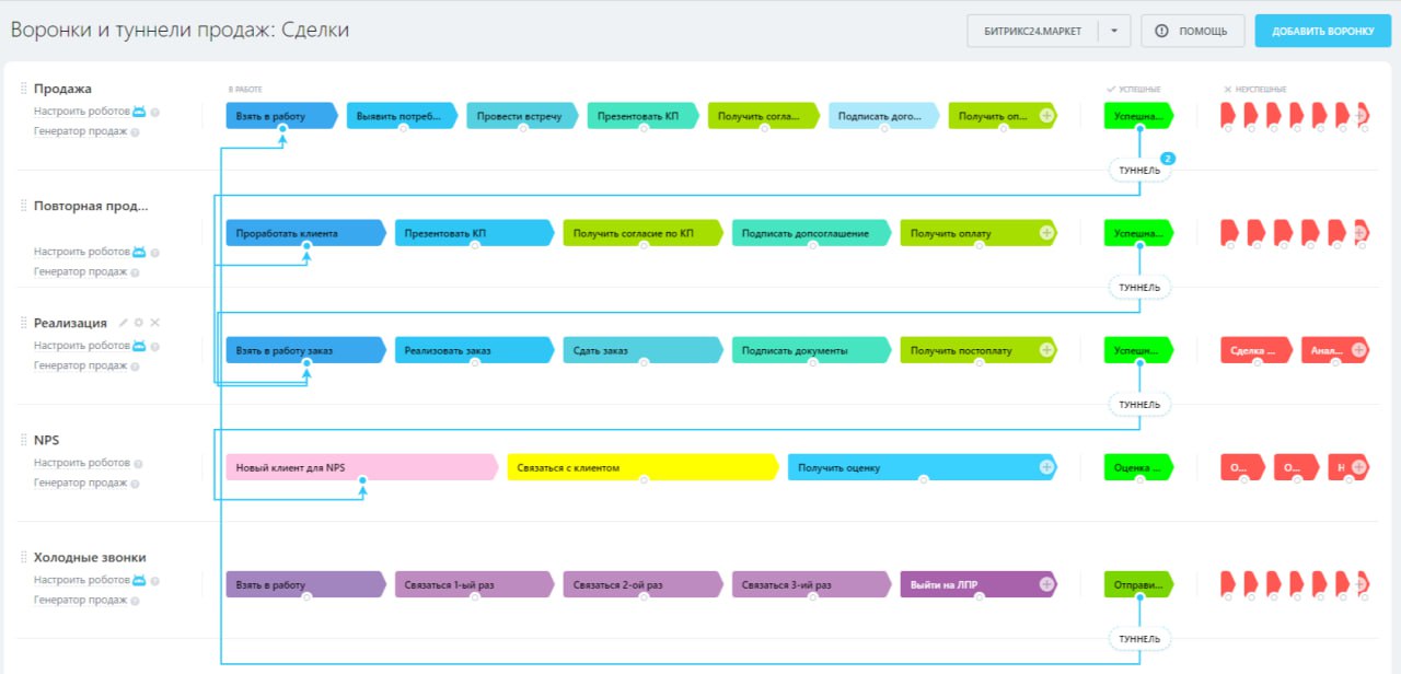 Воронка "Реализация": Взять в работу заказ —> Реализовать заказ —> Сдать заказ —> Подписать документы —> Получить постоплату