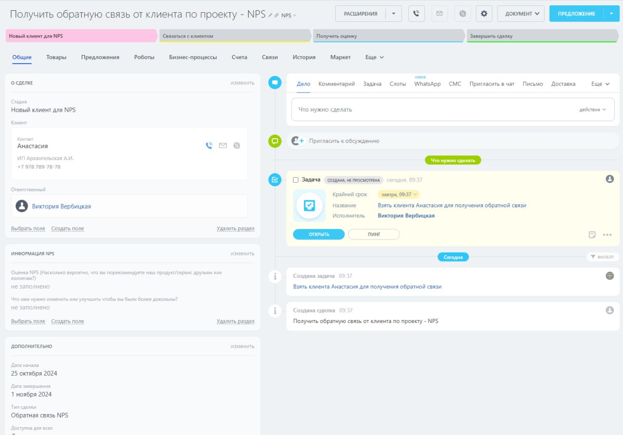 Воронка "NPS": Новый клиент для NPS —> Связаться с клиентом —> Получить оценку