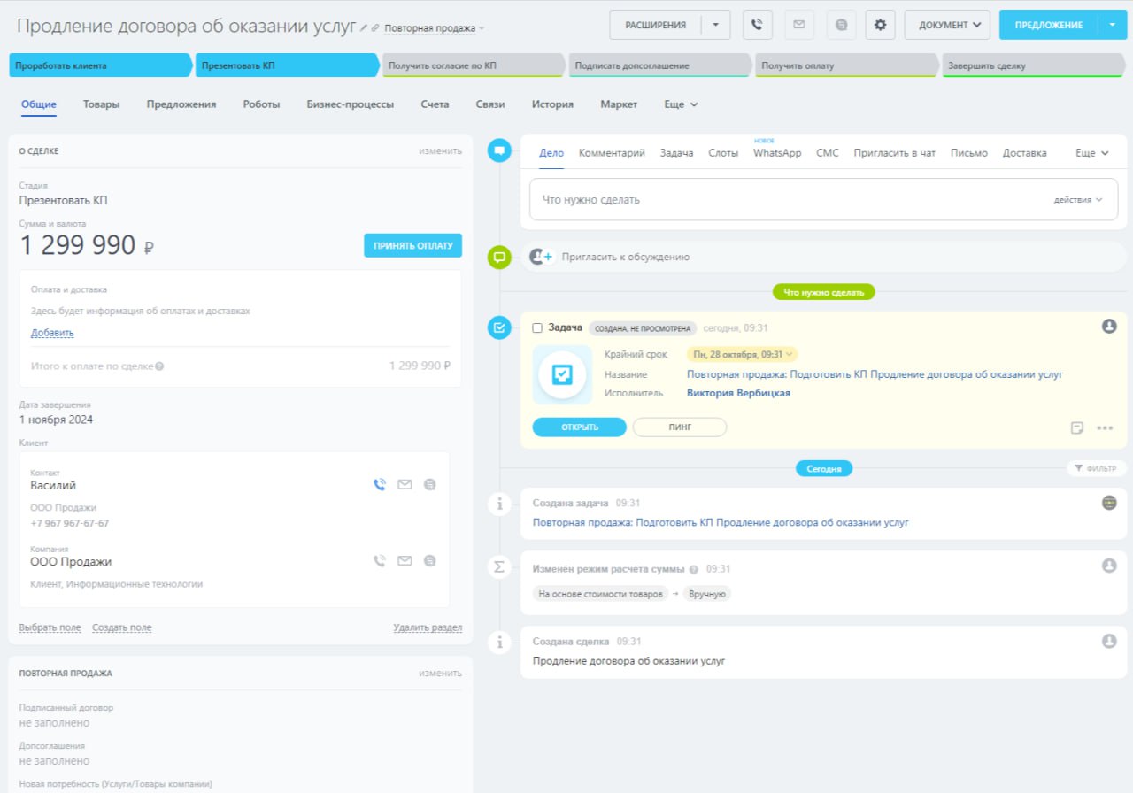 Воронка "Повторная продажа": Проработать клиента —> Презентовать КП —> Получить согласие по КП —> Подписать допсоглашение —> Получить оплату
