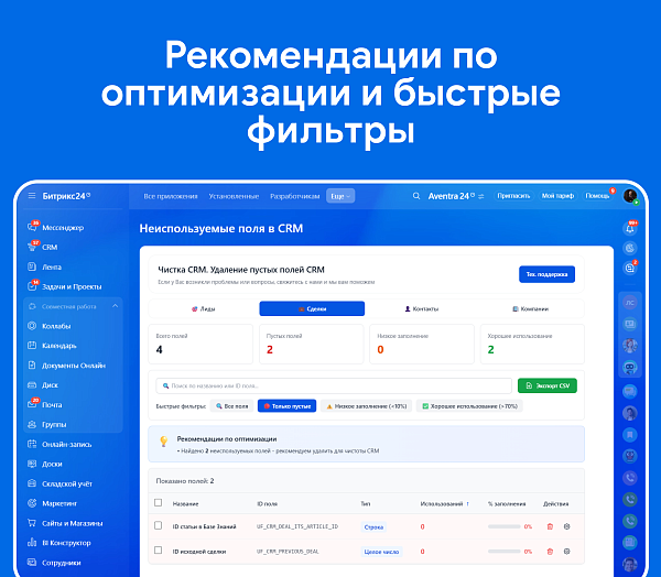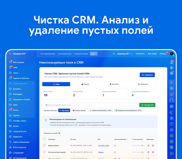 После работы с приложением вы получите чистую, оптимизированную CRM с минимальным набором действительно используемых полей. Это ускорит работу системы, упростит обучение новых сотрудников, облегчит настройку карточек и форм, и сделает вашу CRM более управляемой и эффективной.