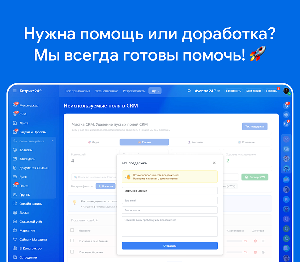Приложение для компаний, которые столкнулись с переизбытком полей в Битрикс24. Со временем в системе накапливаются десятки дублирующихся, неиспользуемых и устаревших полей, которые усложняют работу сотрудников, замедляют загрузку форм и затрудняют настройку интеграций. Приложение помогает навести порядок в CRM, выявляя поля, которые не приносят пользы, и предоставляя данные для принятия обоснованных решений об их удалении.
