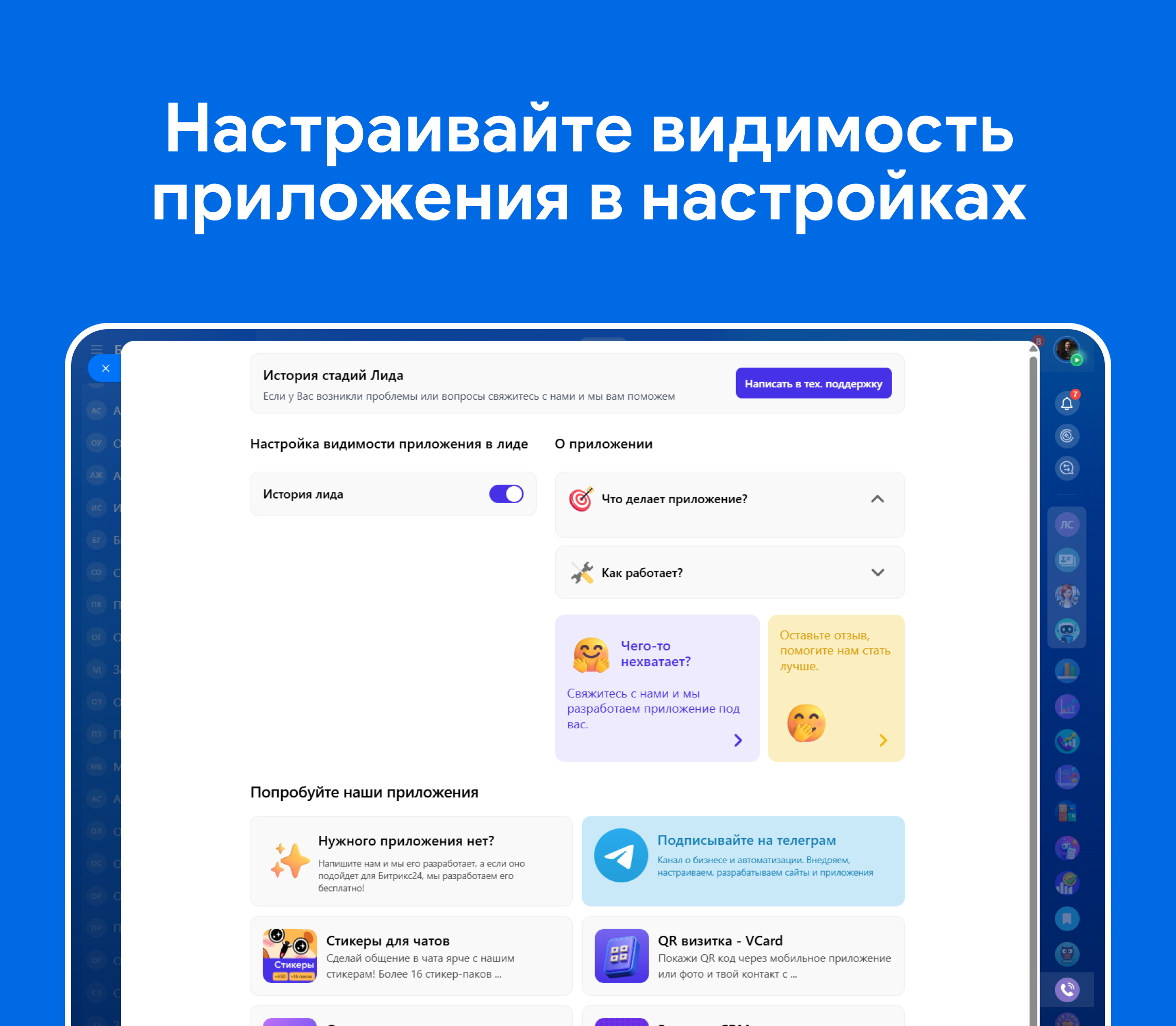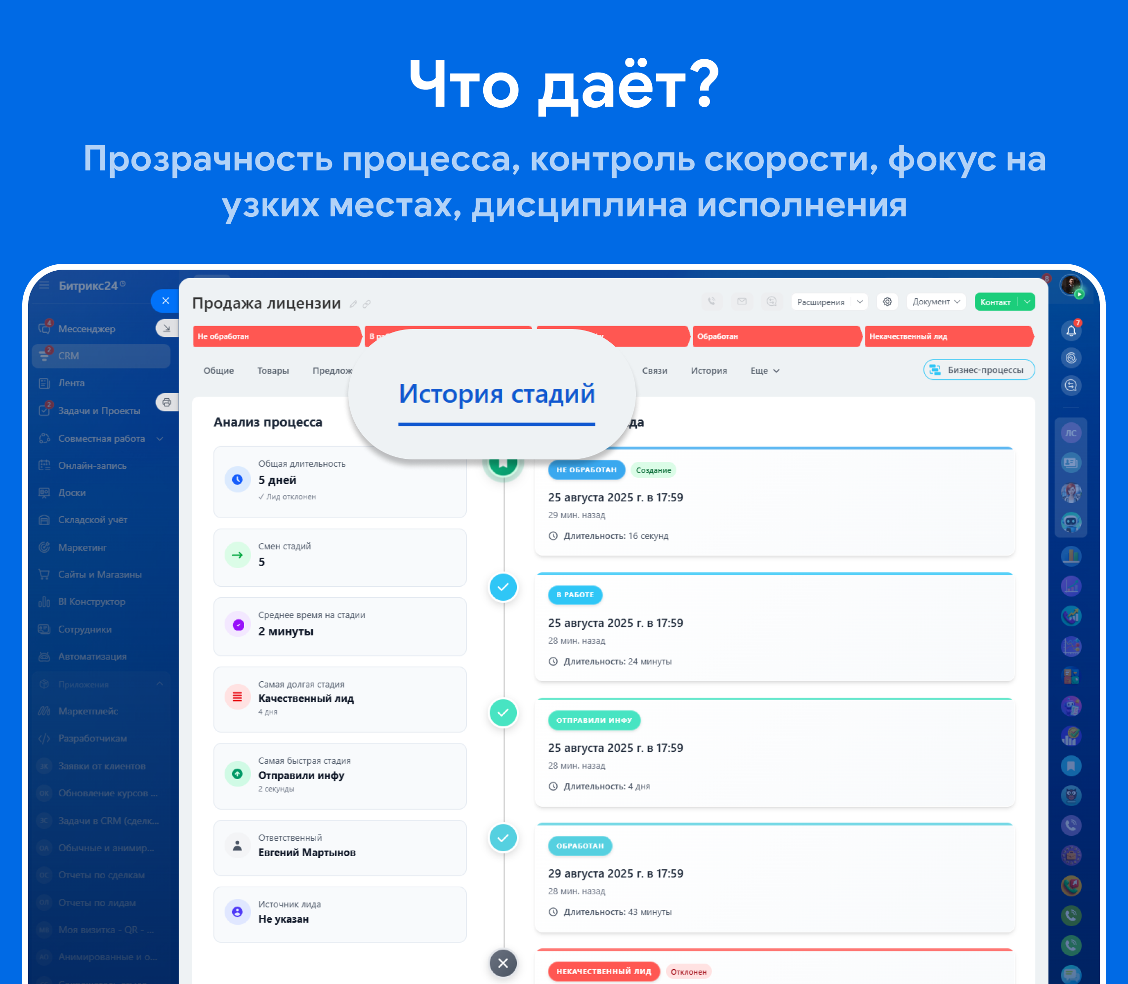 История стадий Лида визуализирует, как менялся статус лида с момента создания до текущего состояния или закрытия. Приложение строит наглядную временную линию, считает ключевые метрики и помогает быстро понять, где тормозит процесс до конверсии в сделку.