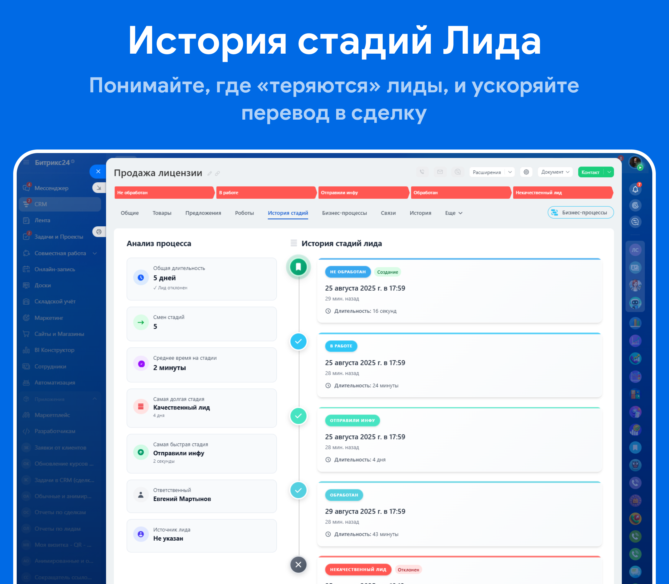 Понимайте, где «теряются» лиды, и ускоряйте перевод в сделку. История стадий Лида превращает разрозненные изменения статусов в наглядную аналитику и управляемый процесс.