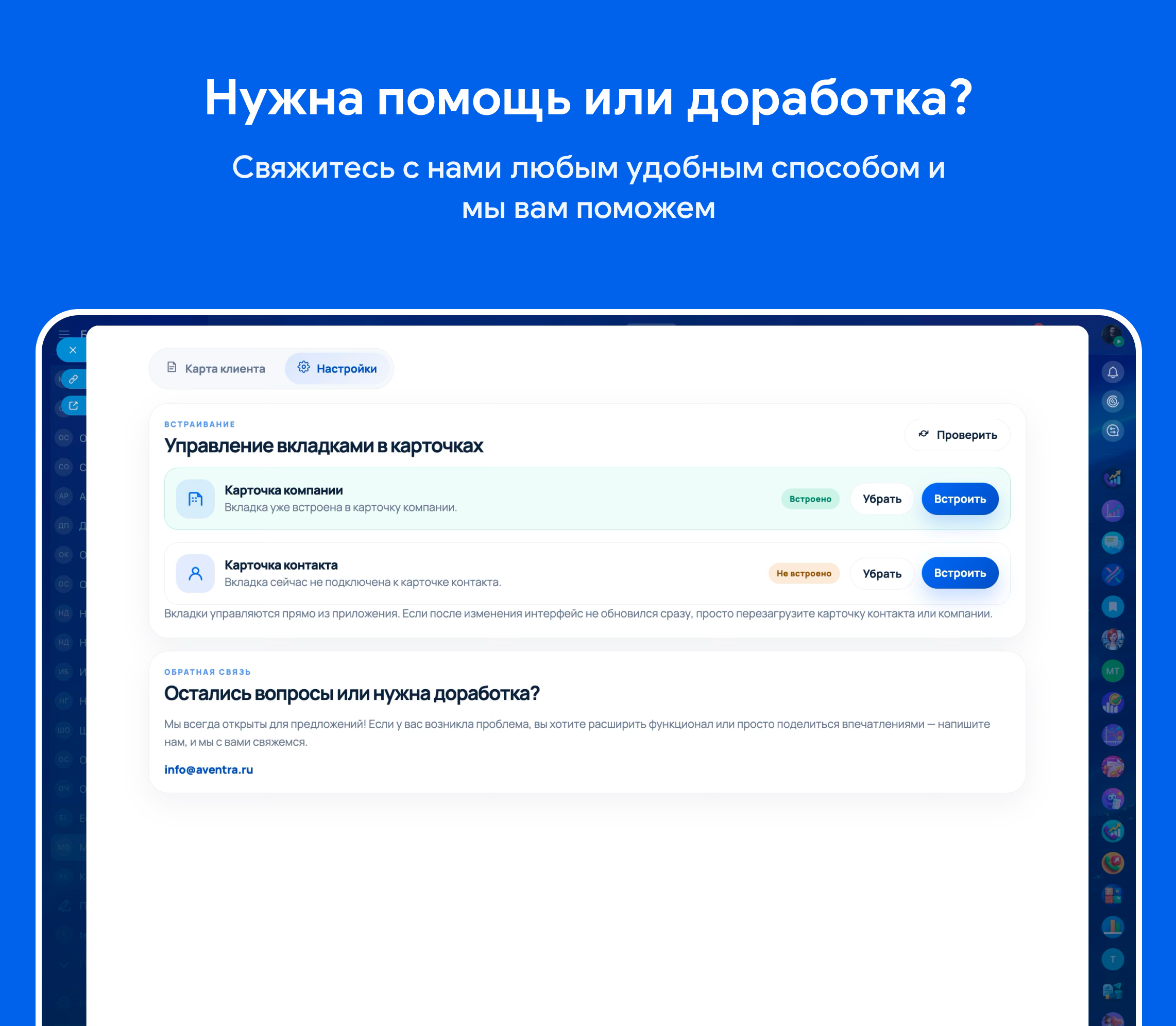 - Даёт отдельный экран настроек, где можно быстро проверить, удалить и заново встроить вкладки приложения в карточку компании и карточку контакта.