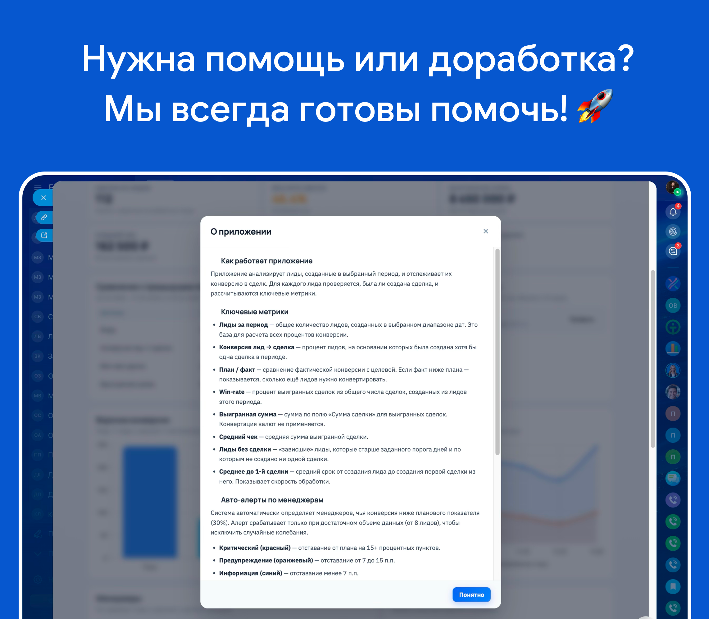 Мощное аналитическое приложение для CRM, которое помогает руководителям отделов продаж и маркетинга отслеживать эффективность работы с лидами и контролировать их конверсию в сделки.