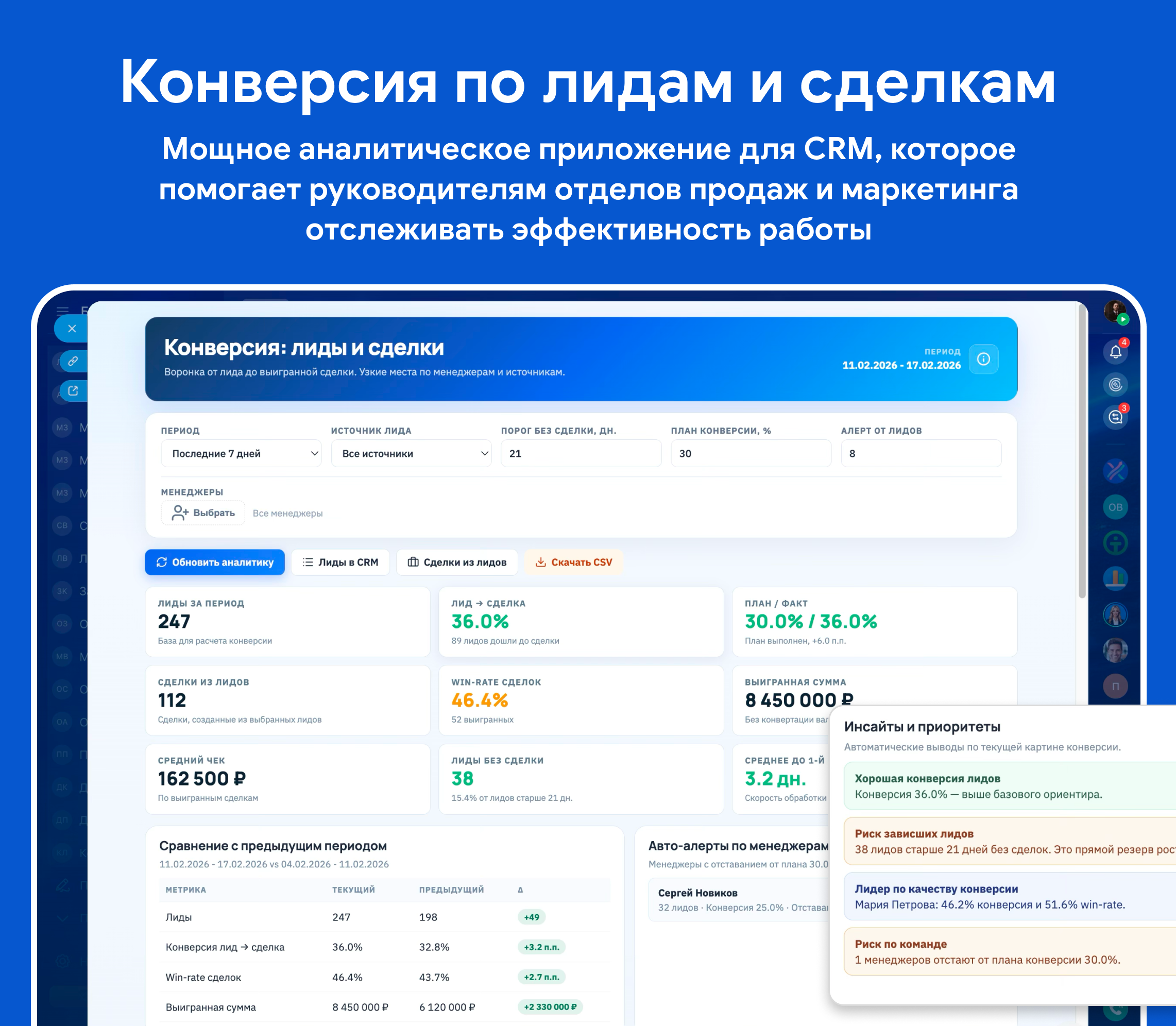 - Таблица по менеджерам: лиды, конвертированные лиды, конверсия, сделки, win-rate, выигранная сумма, зависшие лиды