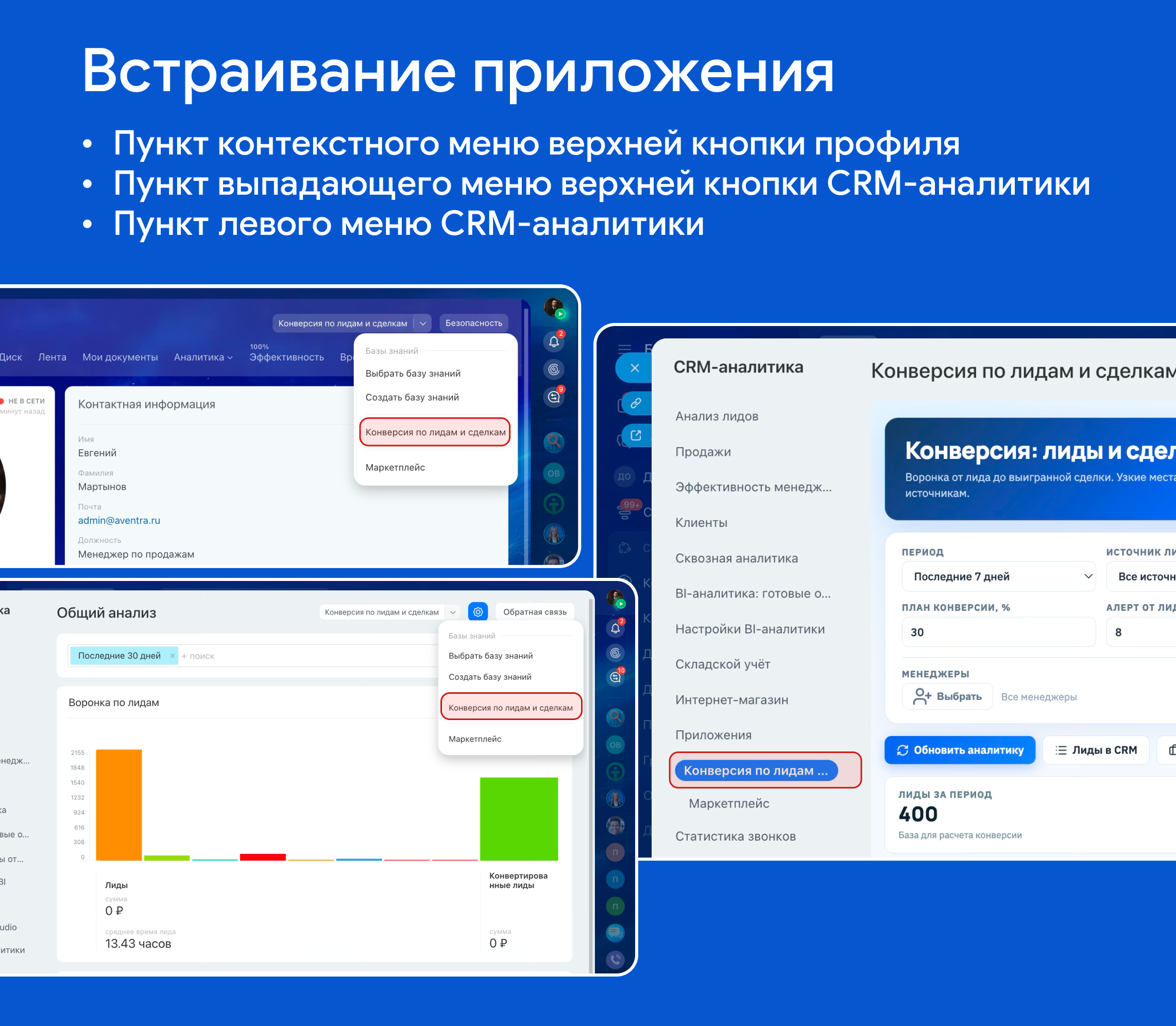 - Быстрый доступ к спискам лидов и сделок в CRM