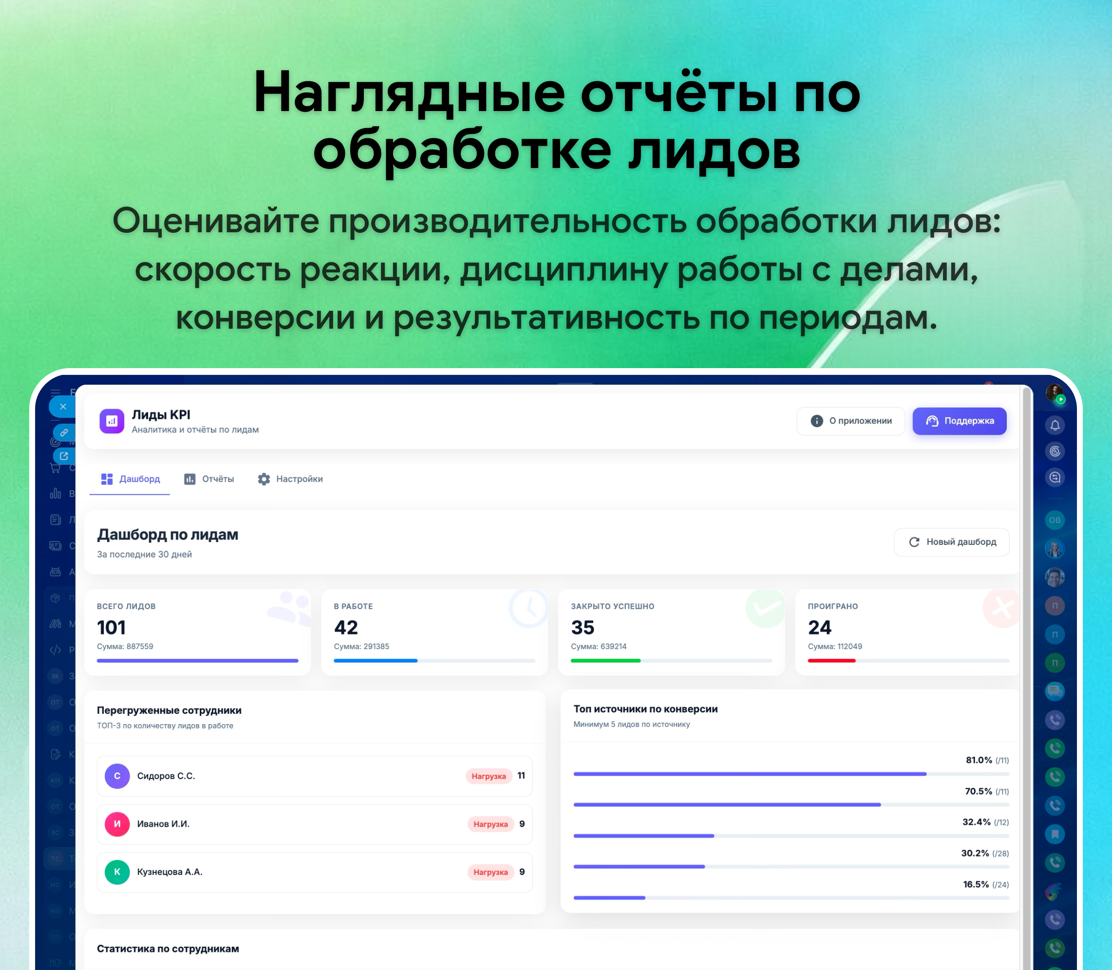 - Контроль скорости реакции на новые лиды и соблюдения регламента обработки.