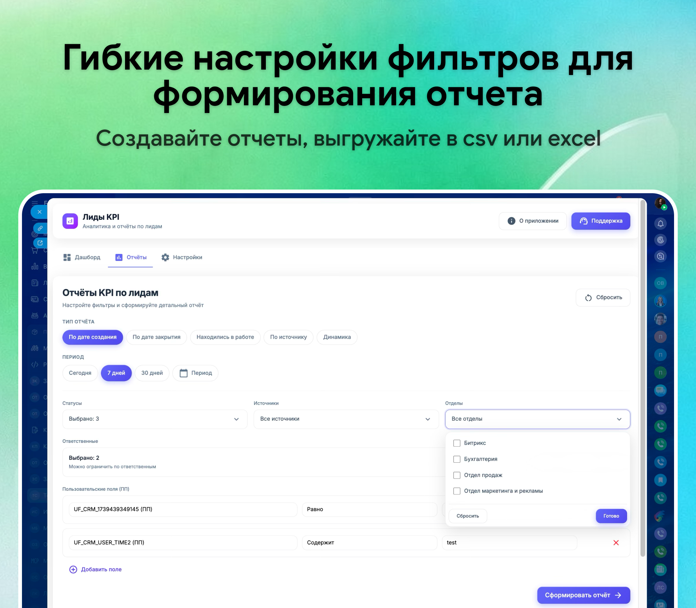 - Формирование отчёта «на лету» с фильтрацией по ключевым параметрам.