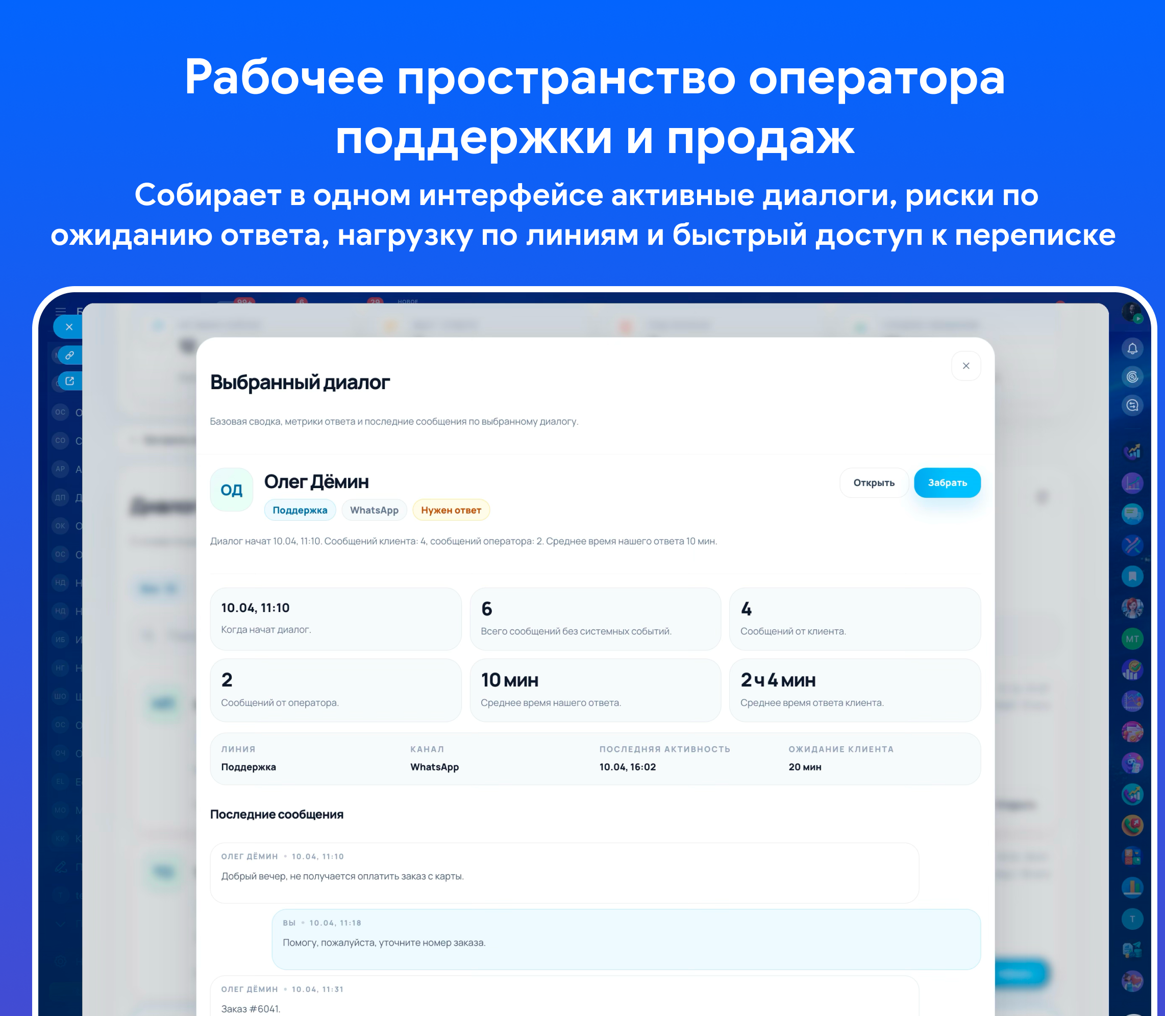 - быстрый переход в диалог и действие «забрать чат» для текущего оператора.
