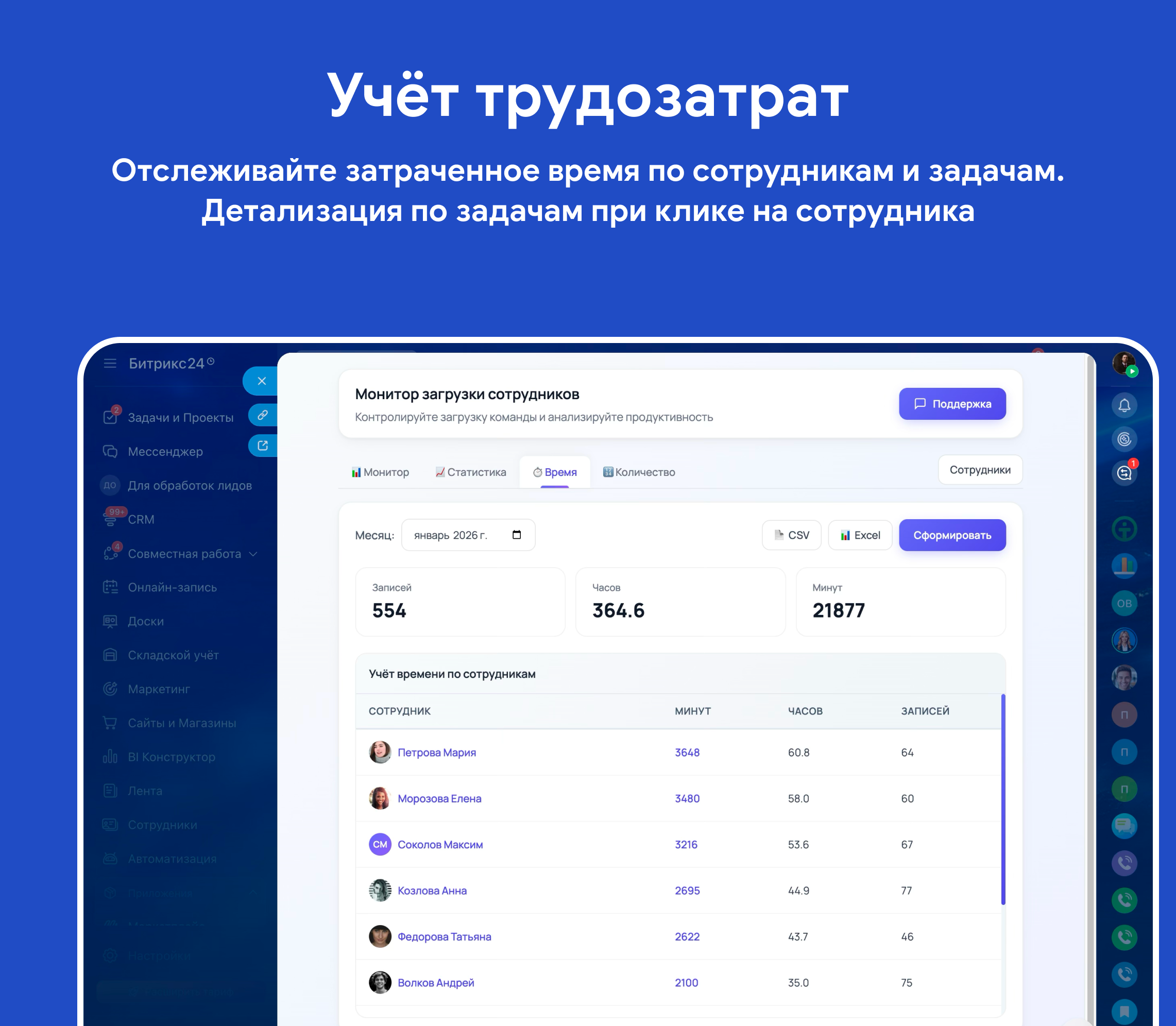 - Экспорт данных — выгружайте отчёты в CSV и Excel для дальнейшего анализа или отчётности