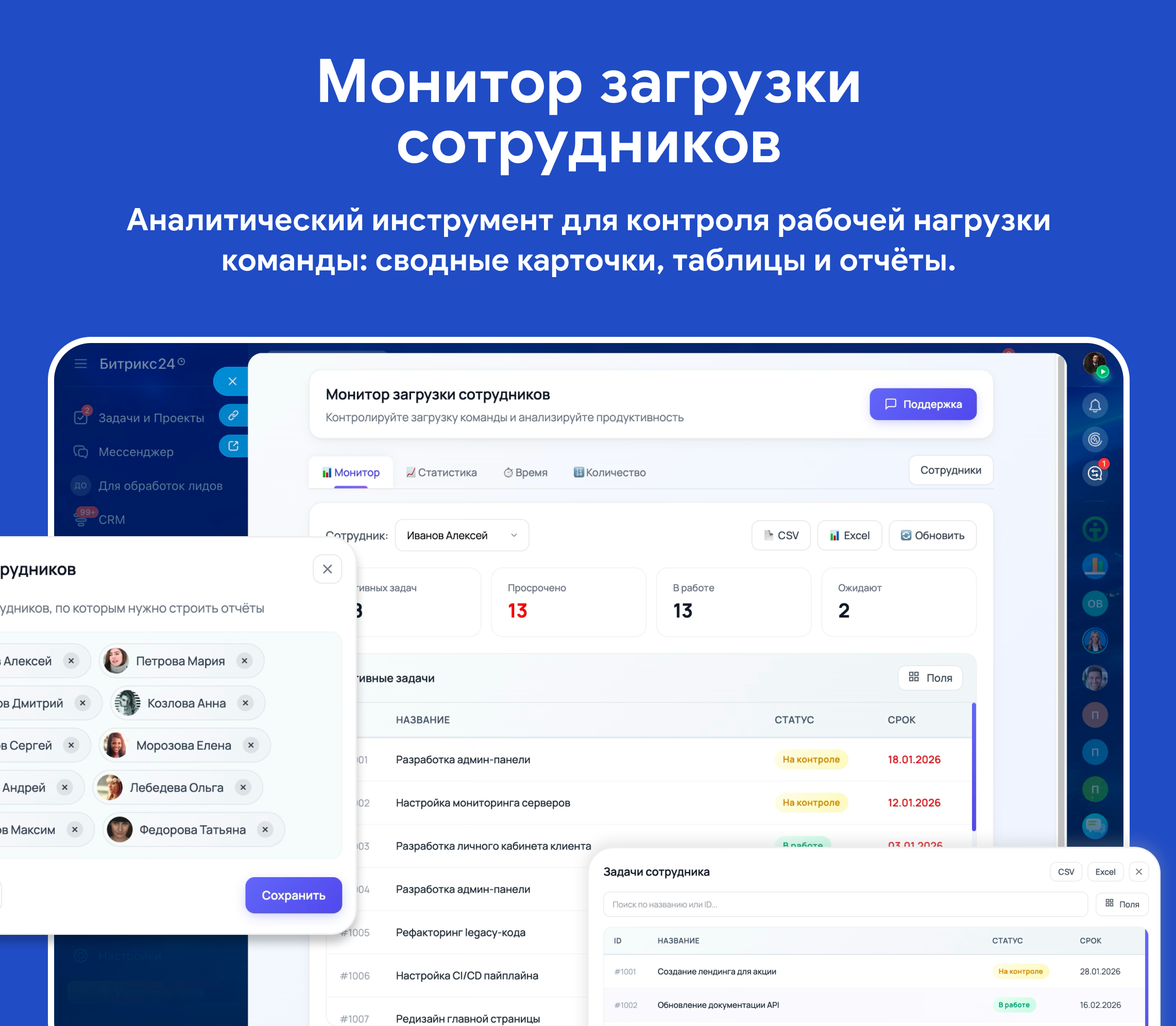 Какие задачи решает- Мониторинг текущей загрузки — видите количество активных задач, просроченных и ожидающих выполнения по каждому сотруднику