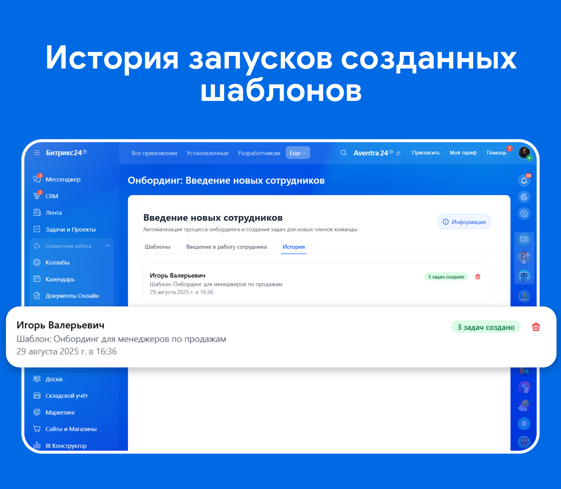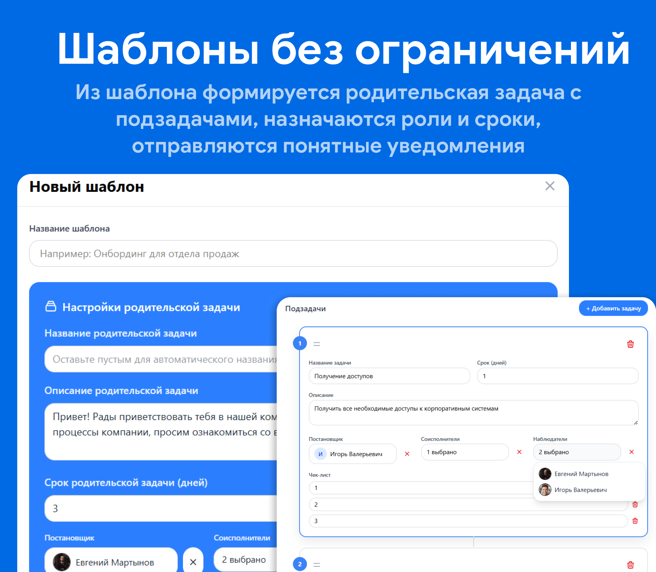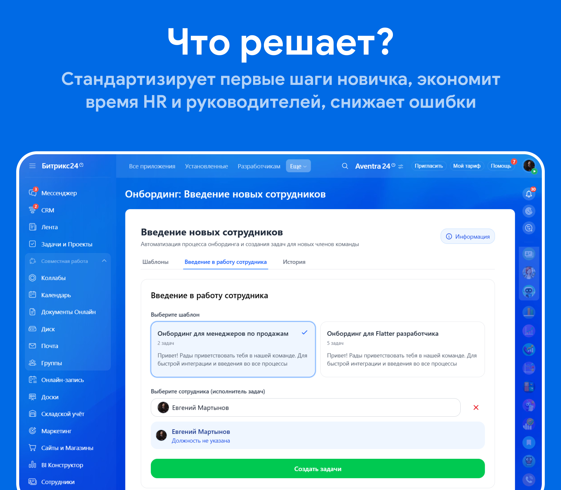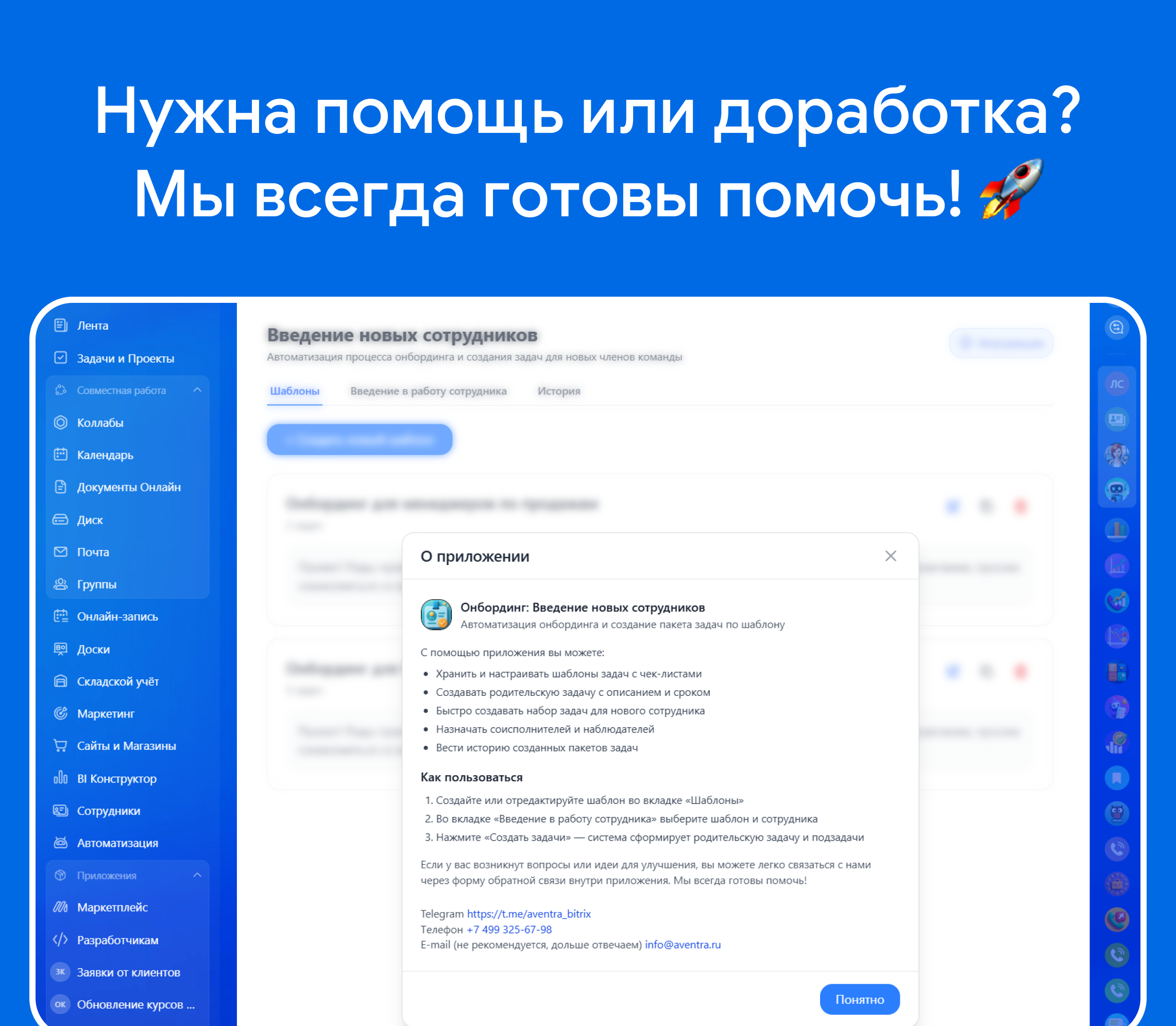 Онбординг: Введение новых сотрудников - это инструмент, который за минуты запускает стандартизированный процесс адаптации: из шаблона формируется родительская задача с подзадачами, назначаются роли и сроки, отправляются понятные уведомления.