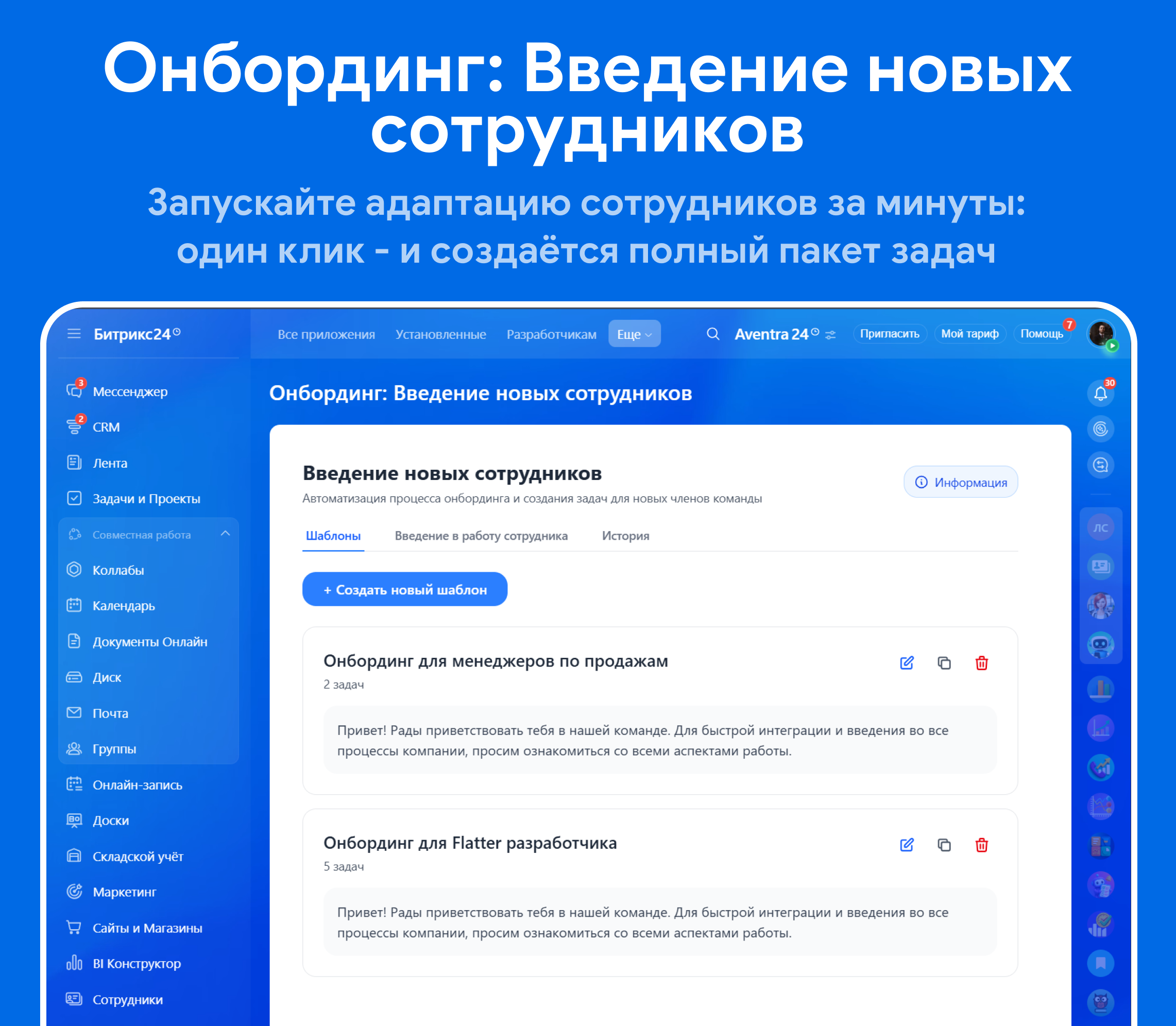Запускайте адаптацию сотрудников за минуты: один клик - и создаётся полный пакет задач с участниками, сроками и понятными уведомлениями