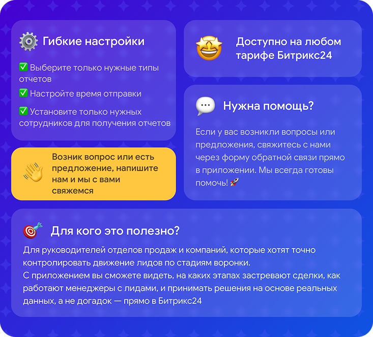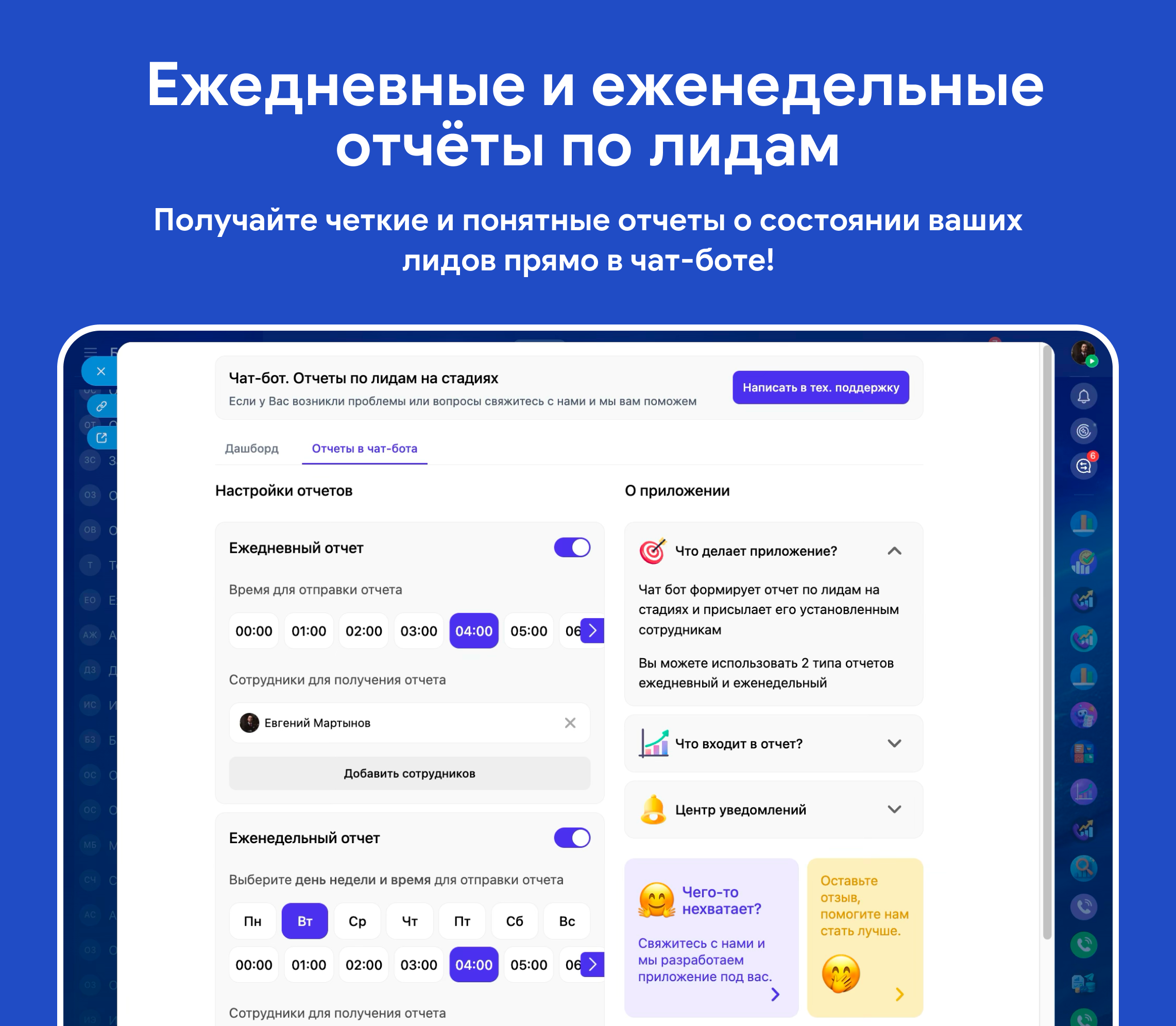 Настройка не требуется, приложение автоматически устанавливает чат-бота, который будет присылать ежедневные и еженедельные отчеты по лидам на стадиях. В интерфейсе настроек вы можете управлять отправлением ежедневных и еженедельных отчетов руководителям и устанавливать время отправки отчета.