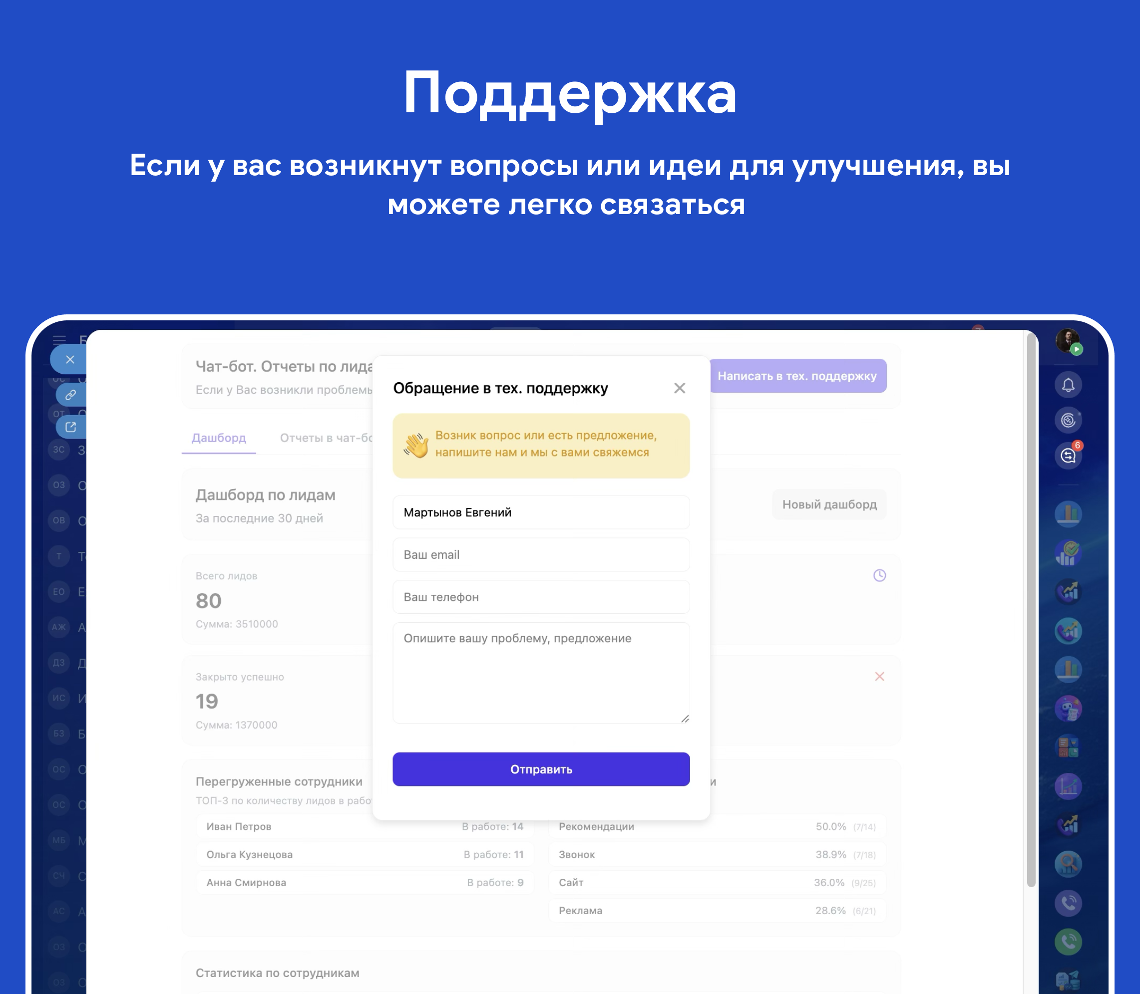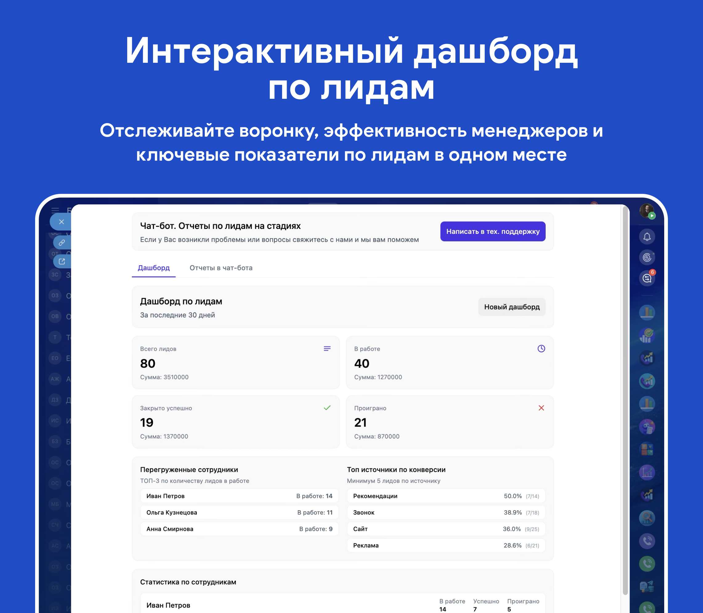 Отслеживайте эффективность менеджеров и ключевые показатели по лидам в одном месте - в дашборде приложения и удобных отчётах прямо в чат-боте.