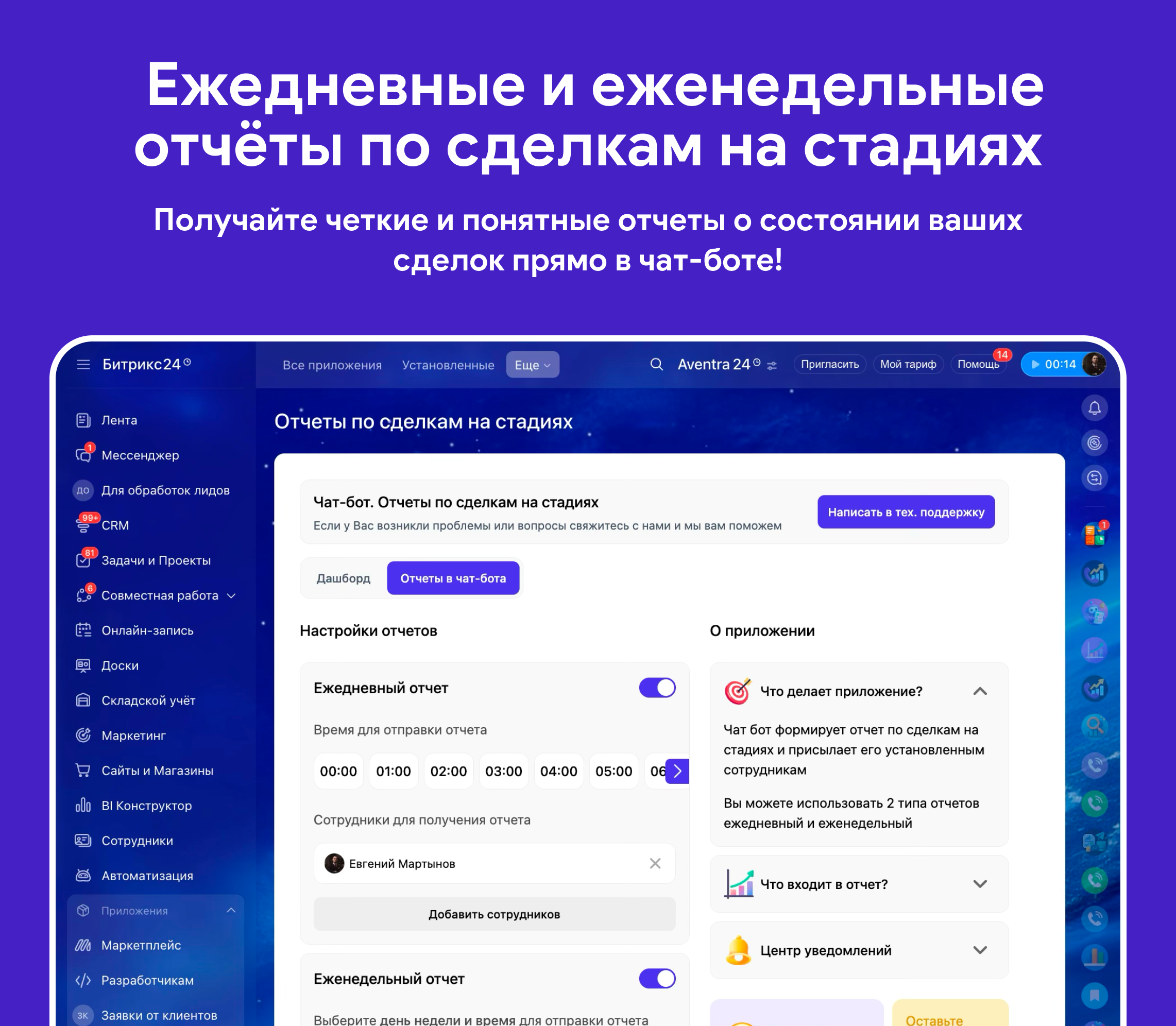 Ежедневные и еженедельные отчёты по ключевым показателям прямо в чат: не нужно заходить в CRM, чтобы оставаться в курсе.