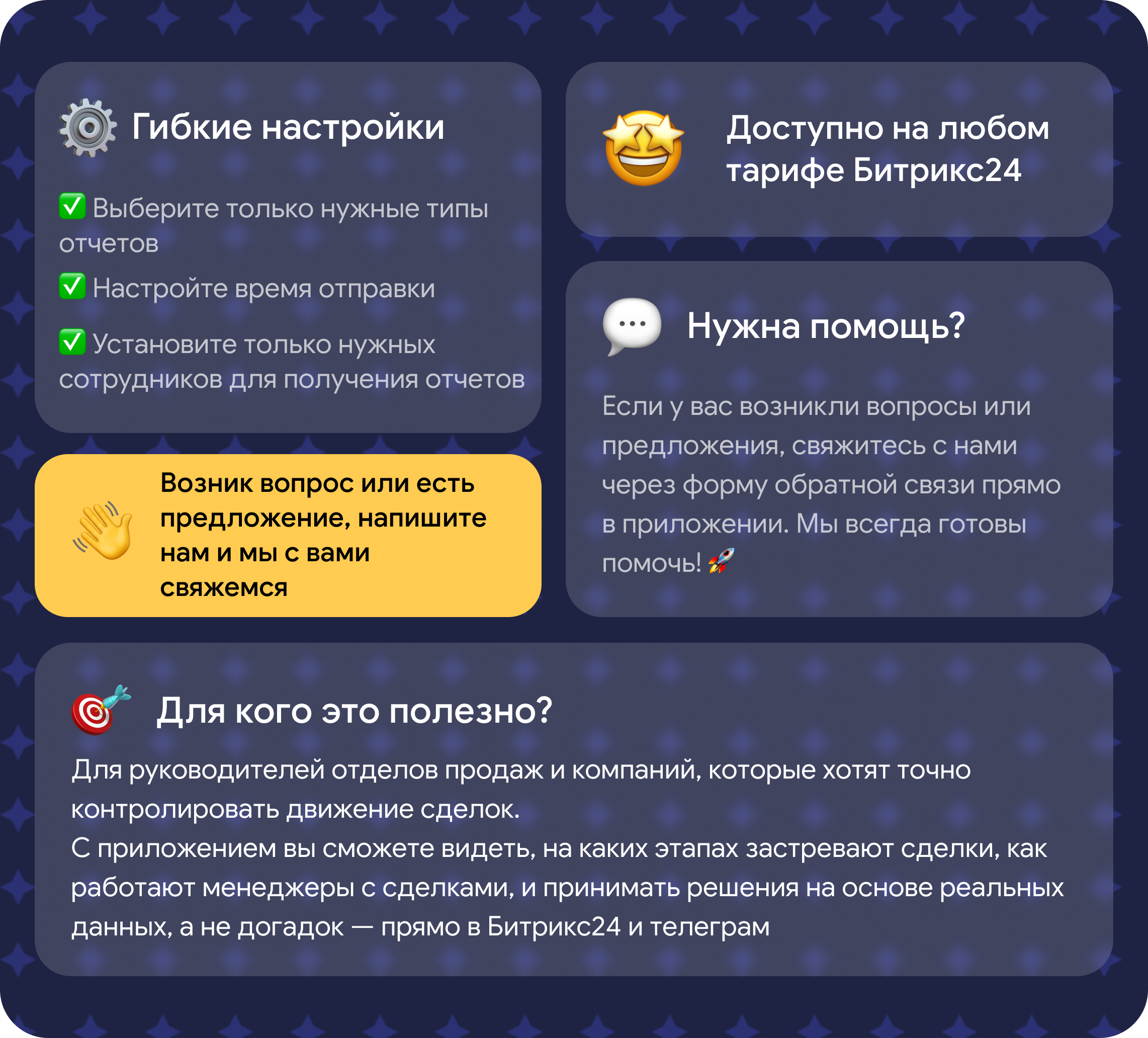 Если у вас возникнут вопросы или идеи для улучшения - используйте форму обратной связи в приложении. Мы всегда готовы помочь!