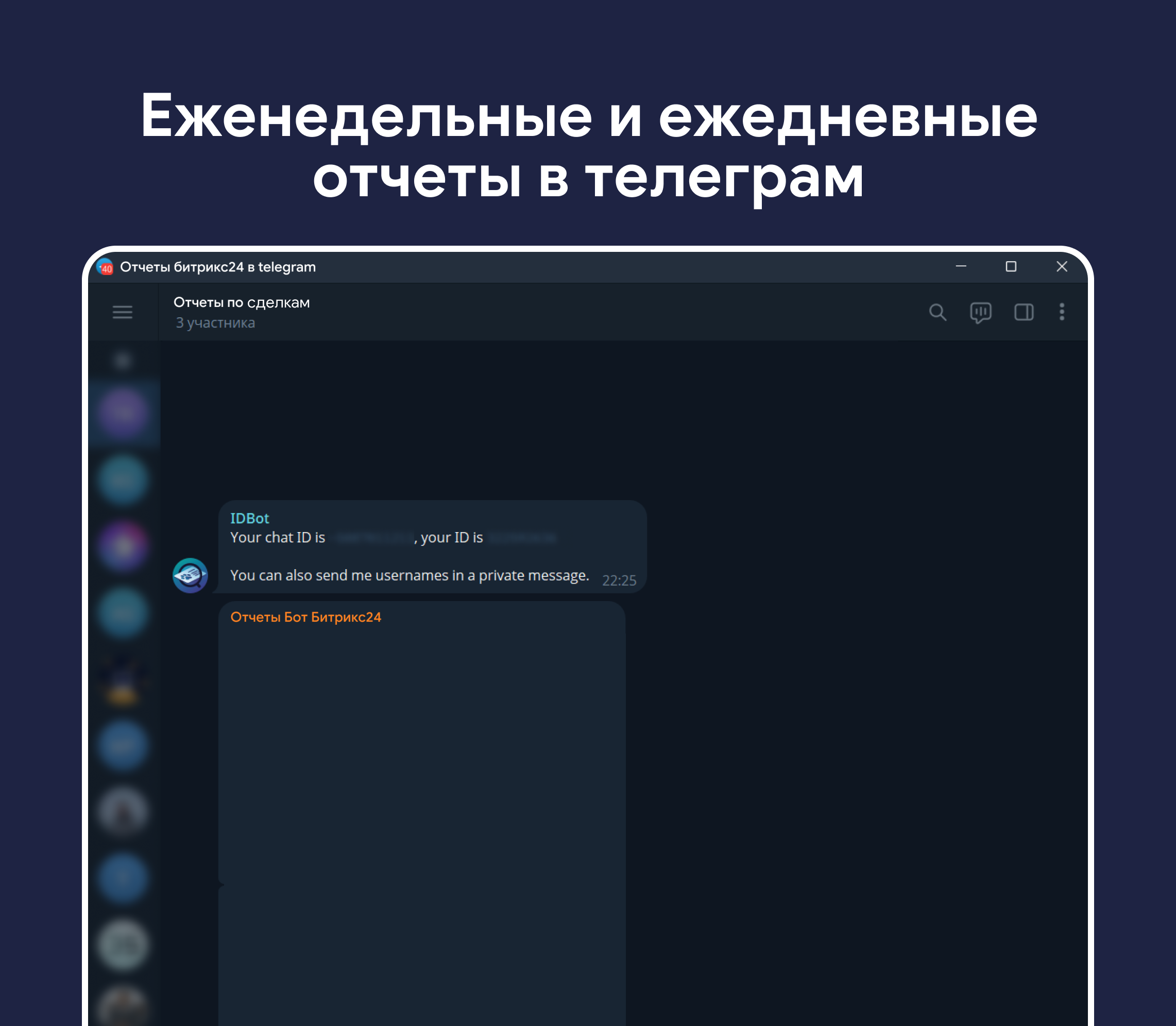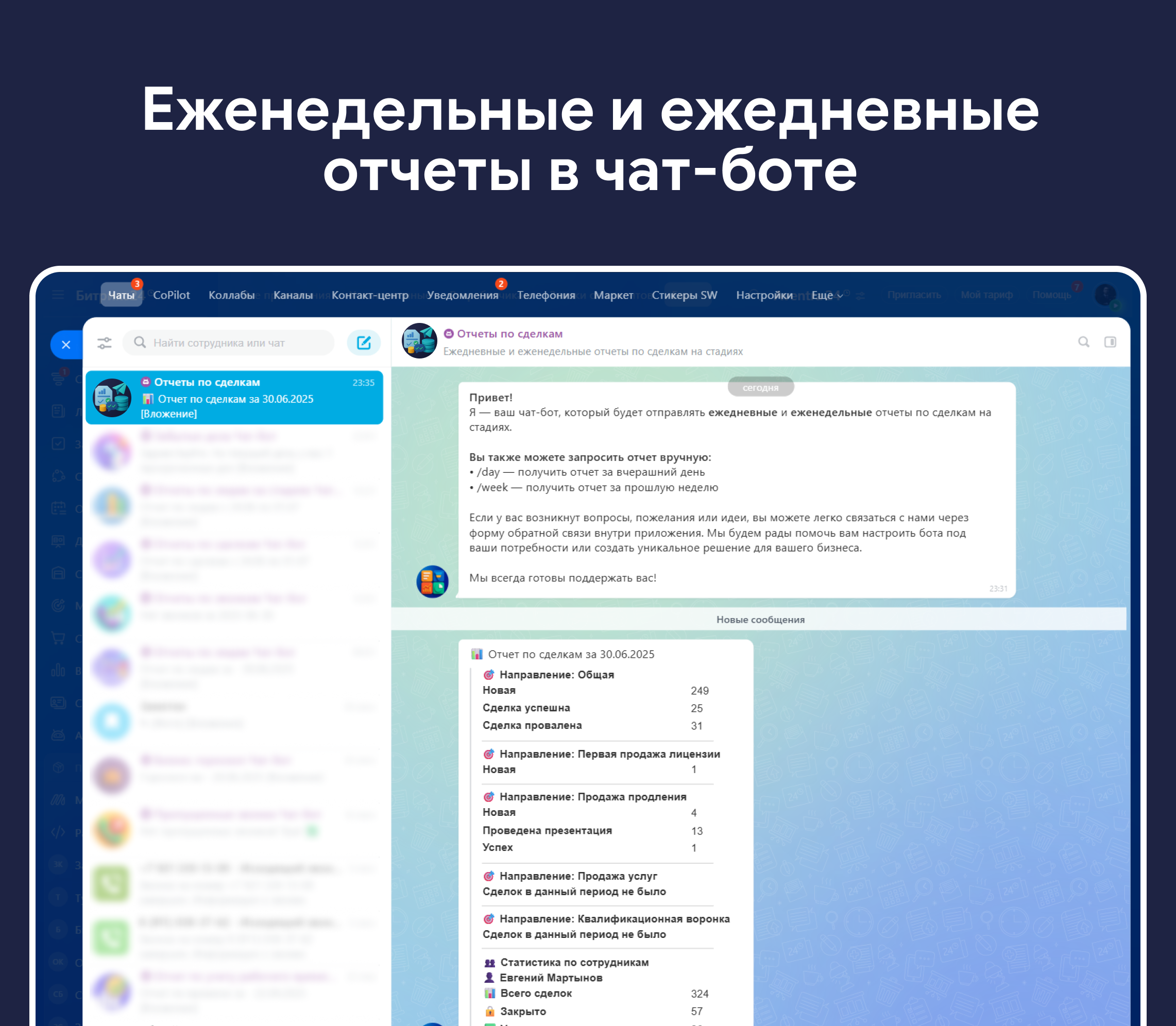 Получайте четкие и понятные отчеты о сделках по стадиям прямо в чат-боте или телеграме!