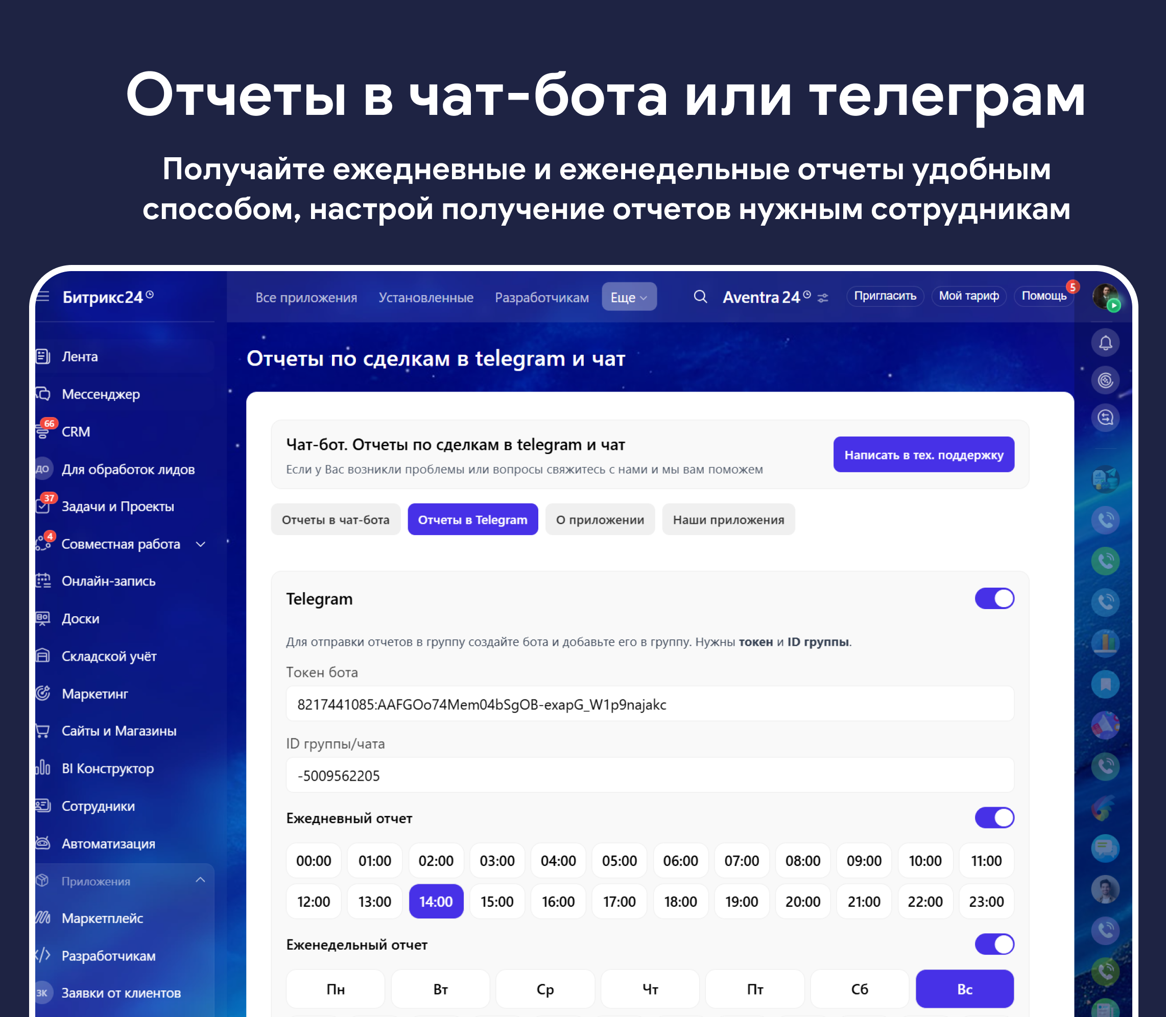 - Включите флаги «Отправлять ежедневный/еженедельный отчет в Telegram» по необходимости