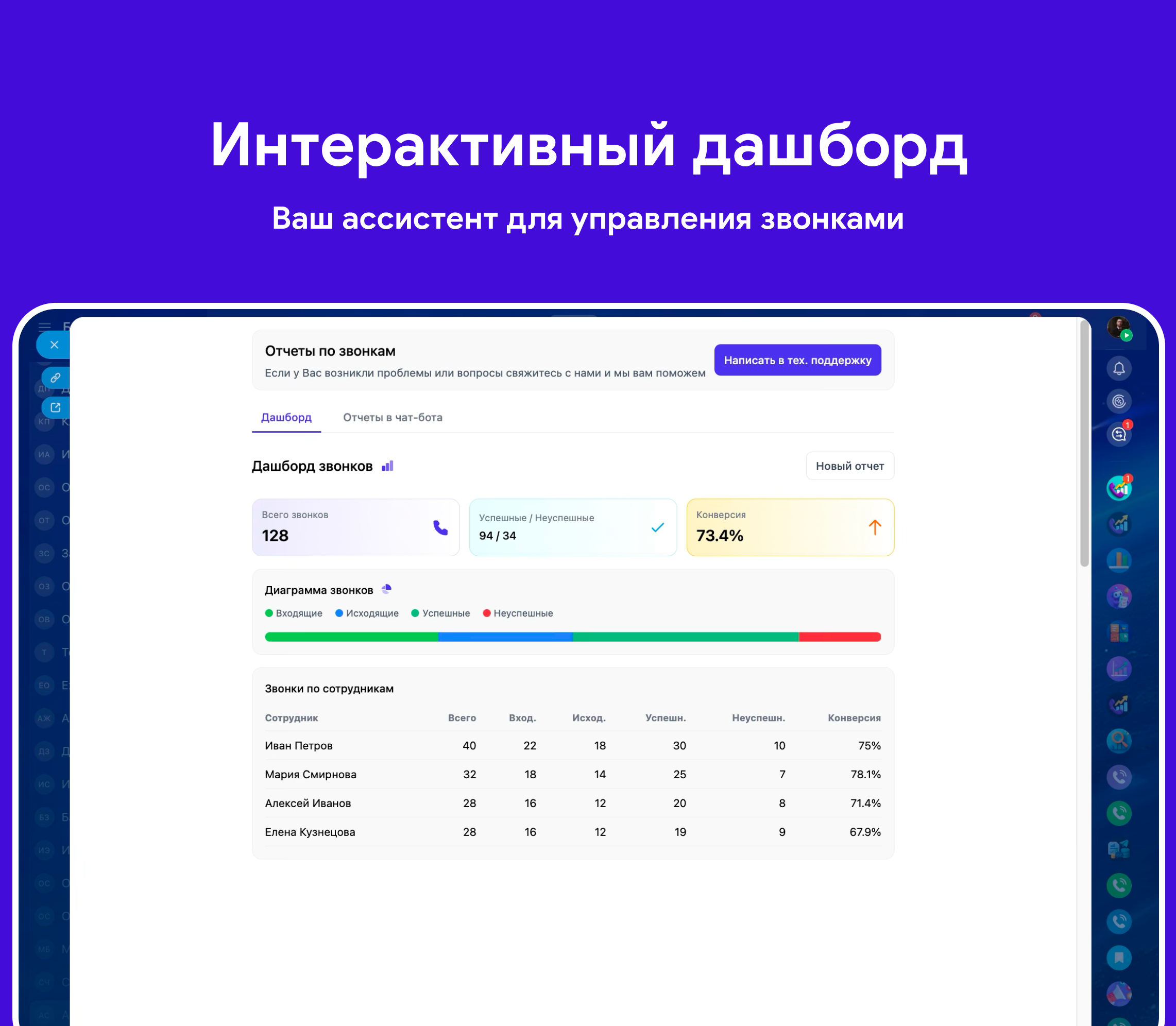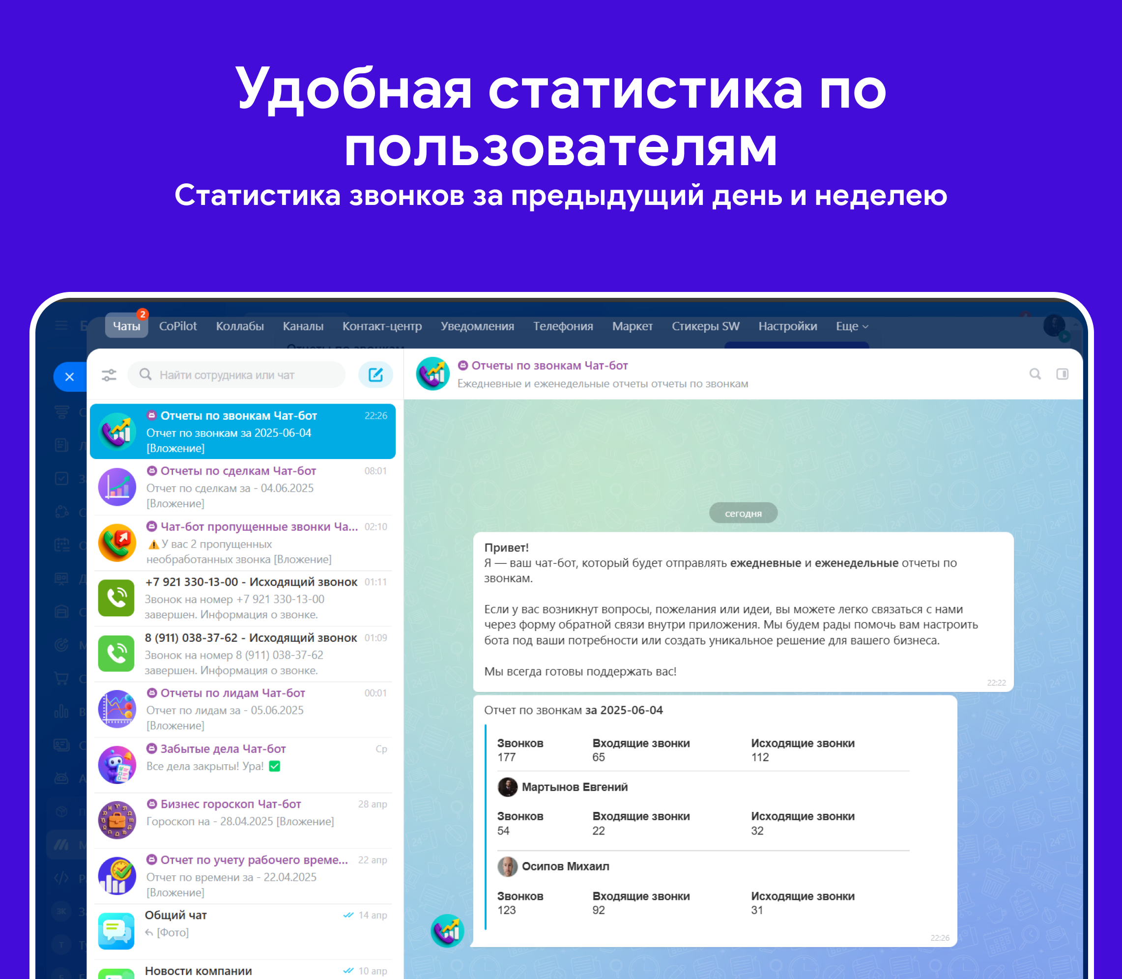 Отчеты по звонкам - ваш личный ассистент, который сам собирает статистику звонков и присылает её выбранным сотрудникам в чат.