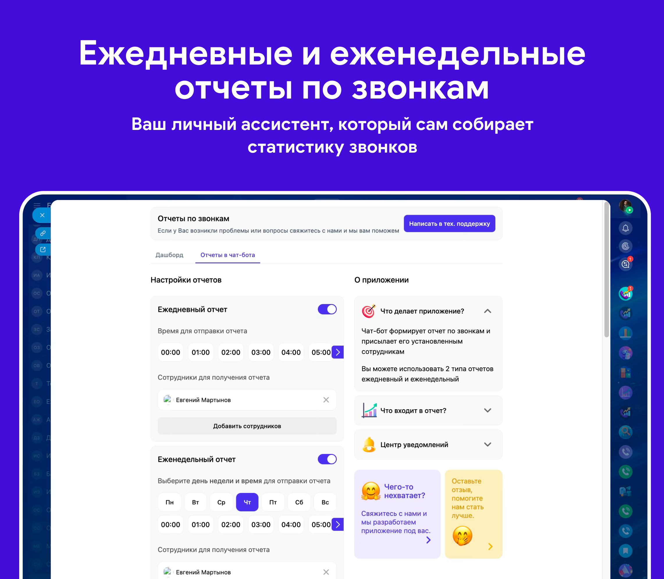 Настройка не требуется, приложение автоматически устанавливает чат-бота, который будет присылать ежедневные и еженедельные отчеты. В интерфейсе настроек вы можете управлять отправлением ежедневных и еженедельных отчетов руководителям и устанавливать время отправки отчета.
