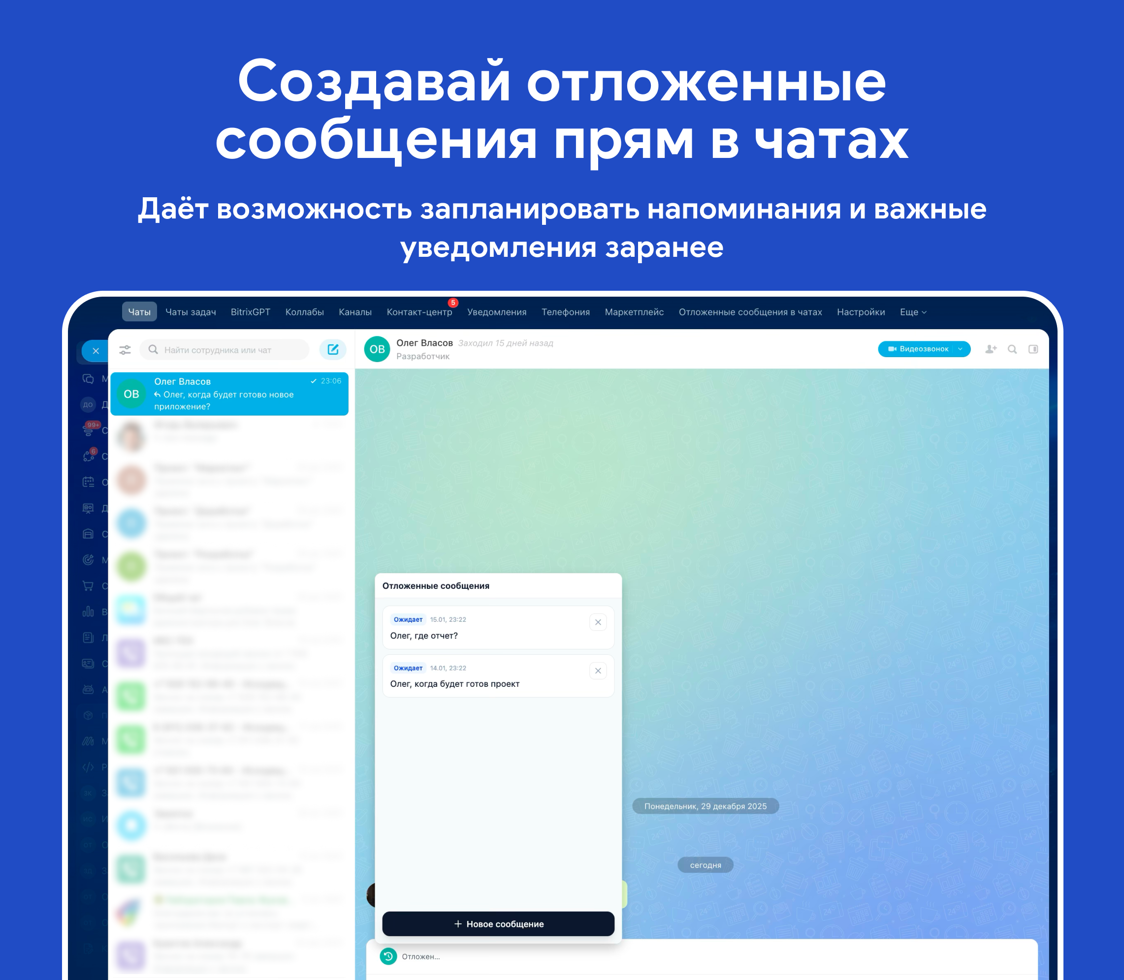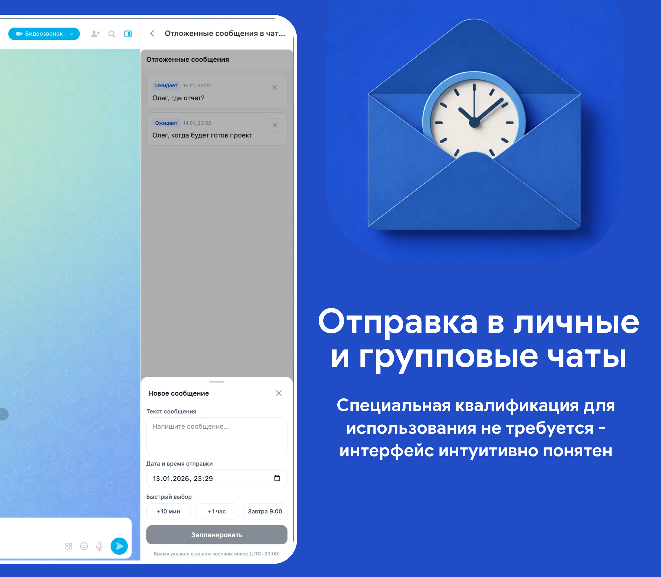 Отложенные сообщения в чатах - решение для планирования отправки сообщений в чатах в заданное время.