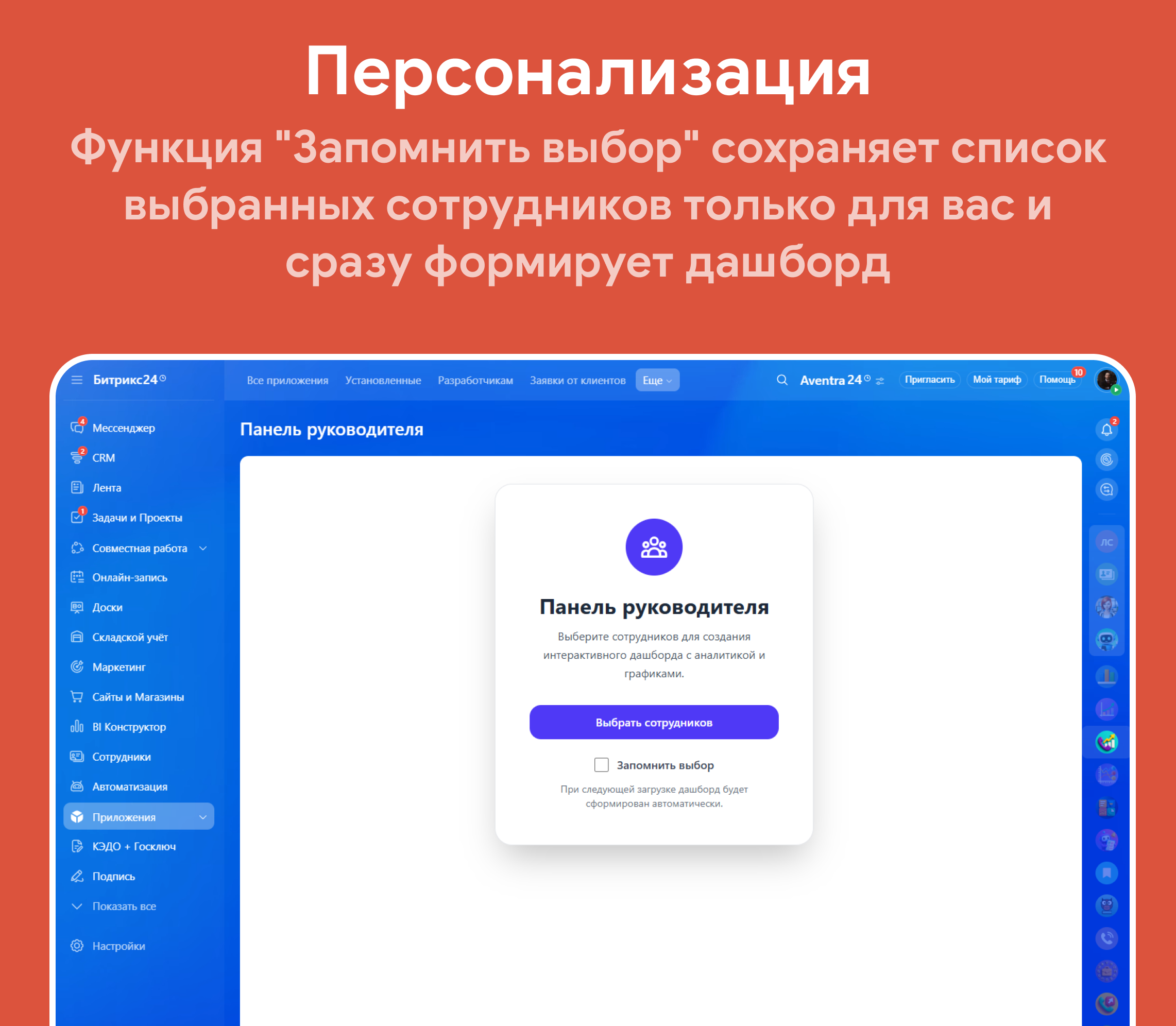 Выбор сотрудников: Формируйте дашборд для всей команды, отдела или проектной группы, просто выбрав нужных пользователей из списка.