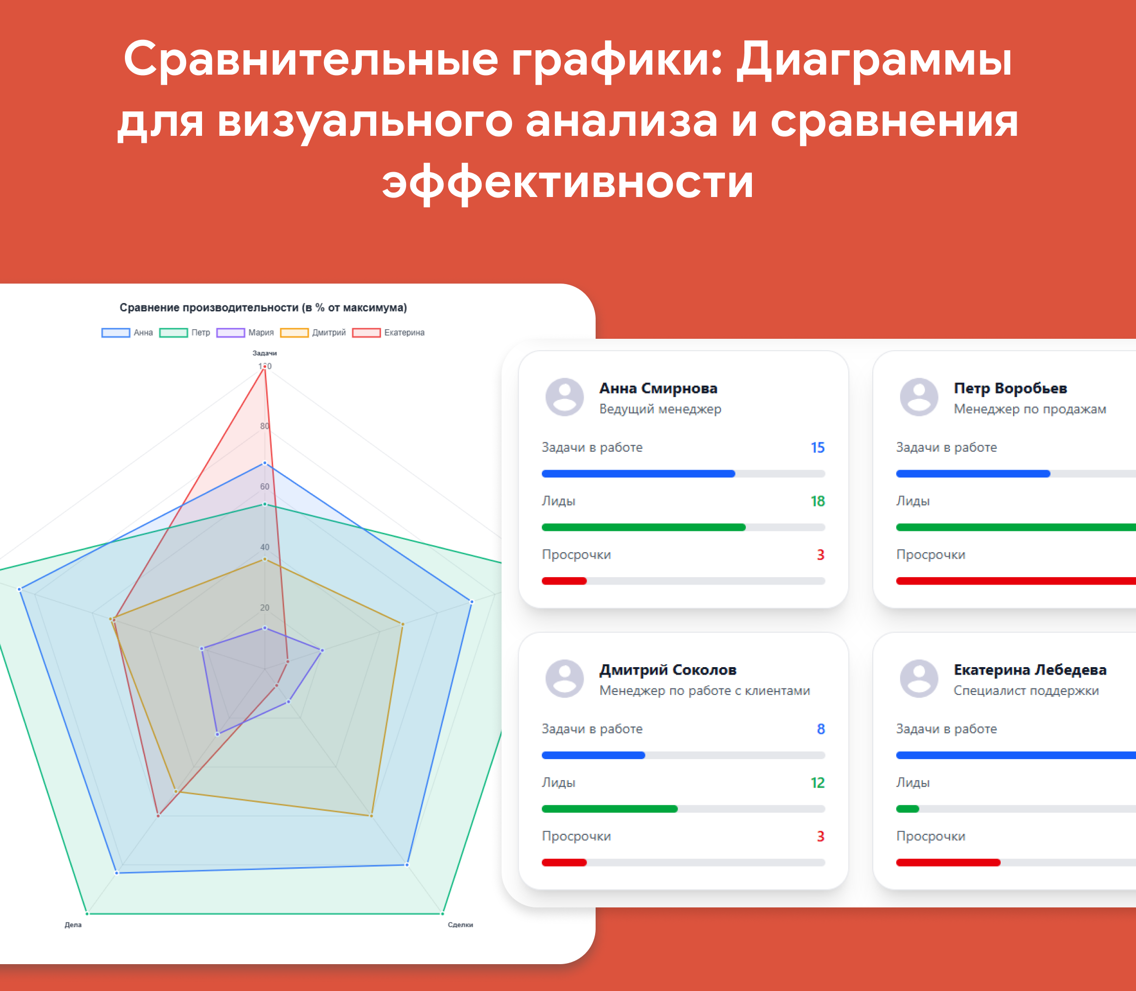 Обеспечивает наглядное сравнение производительности: Легко сравнивайте показатели сотрудников между собой, чтобы принимать взвешенные решения о распределении нагрузки и поощрении.