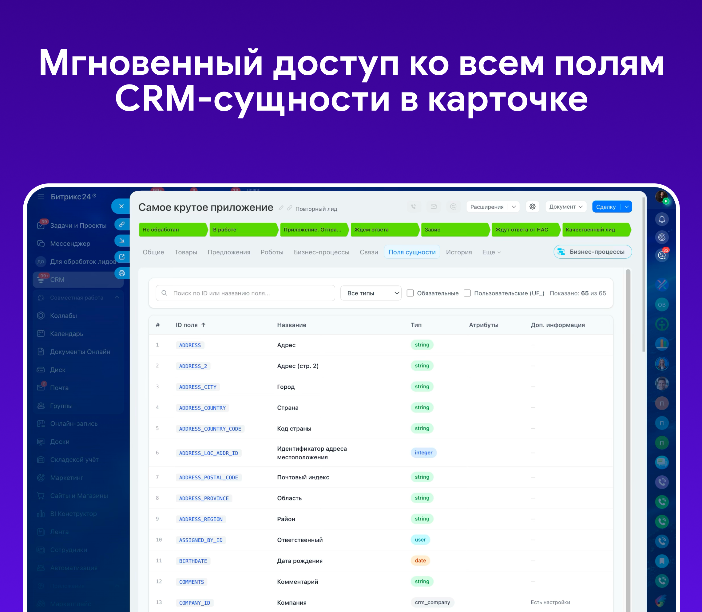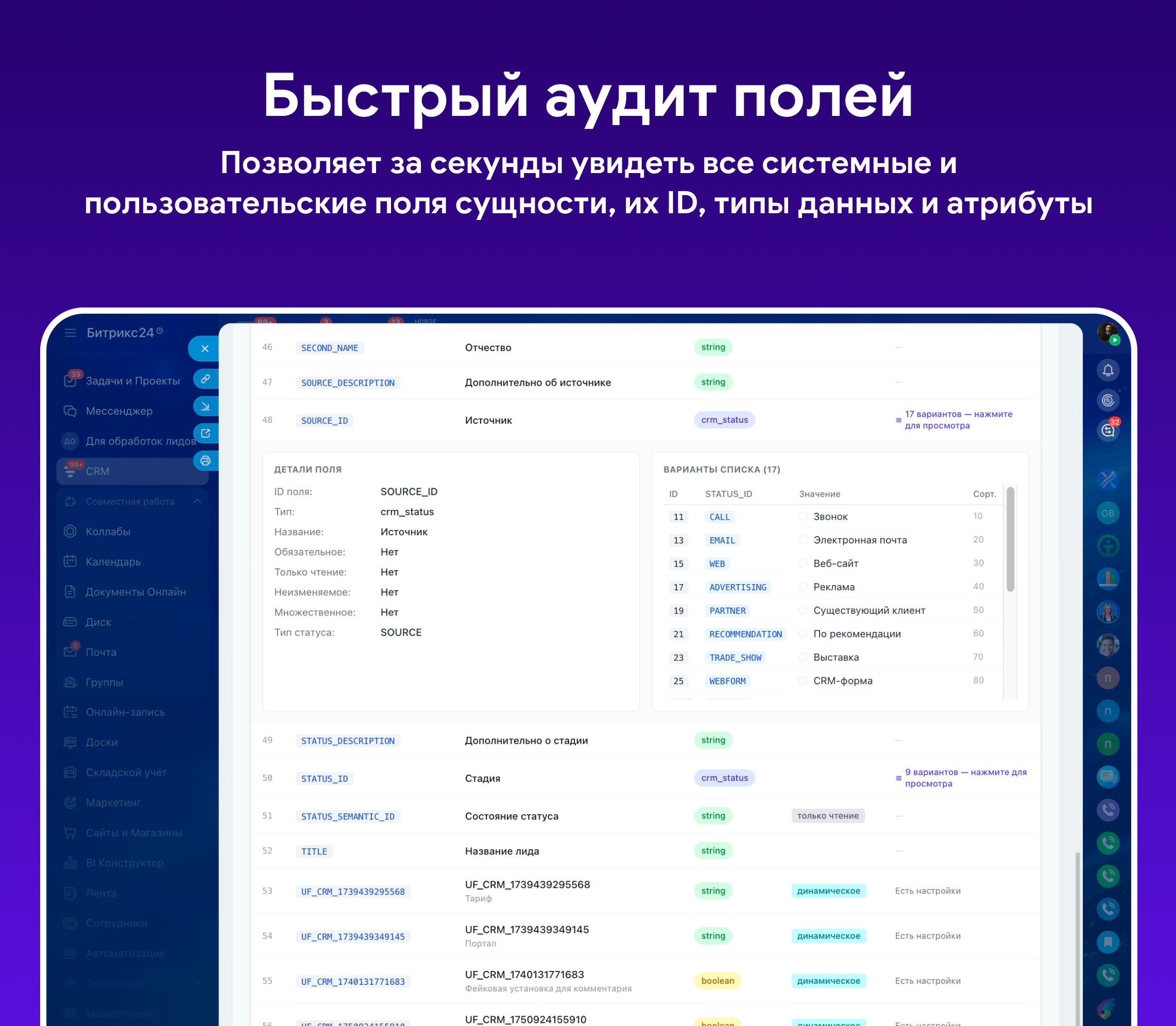 Инструмент для разработчиков, интеграторов и администраторов, который отображает полный перечень полей текущей CRM-сущности (сделки, лиды, контакты, компании) в удобном табличном виде прямо внутри карточки элемента.