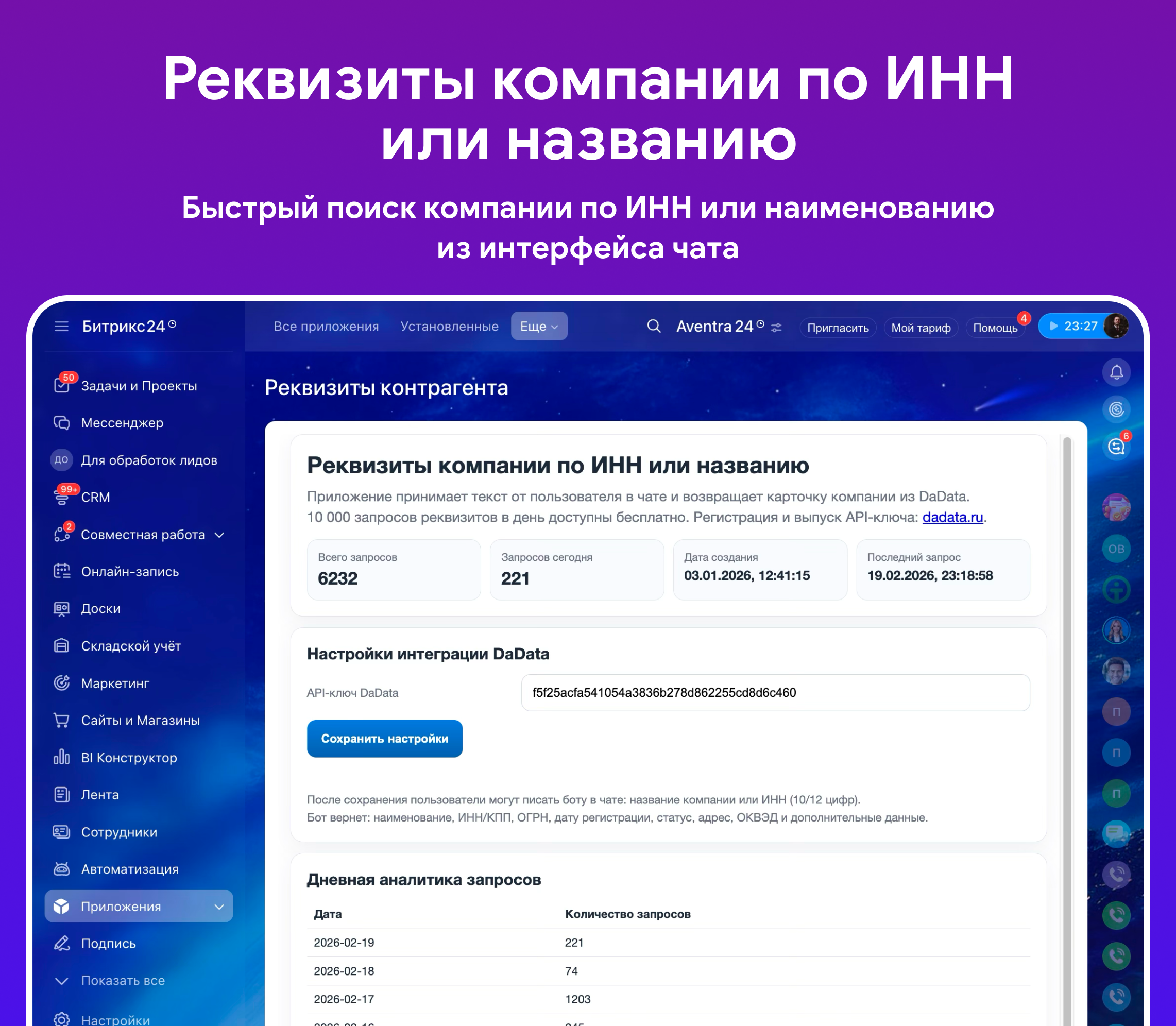 Приложение «Реквизиты контрагента» добавляет в портал чат-бота, который по запросу сотрудника находит компанию по ИНН или названию и возвращает ключевые реквизиты.