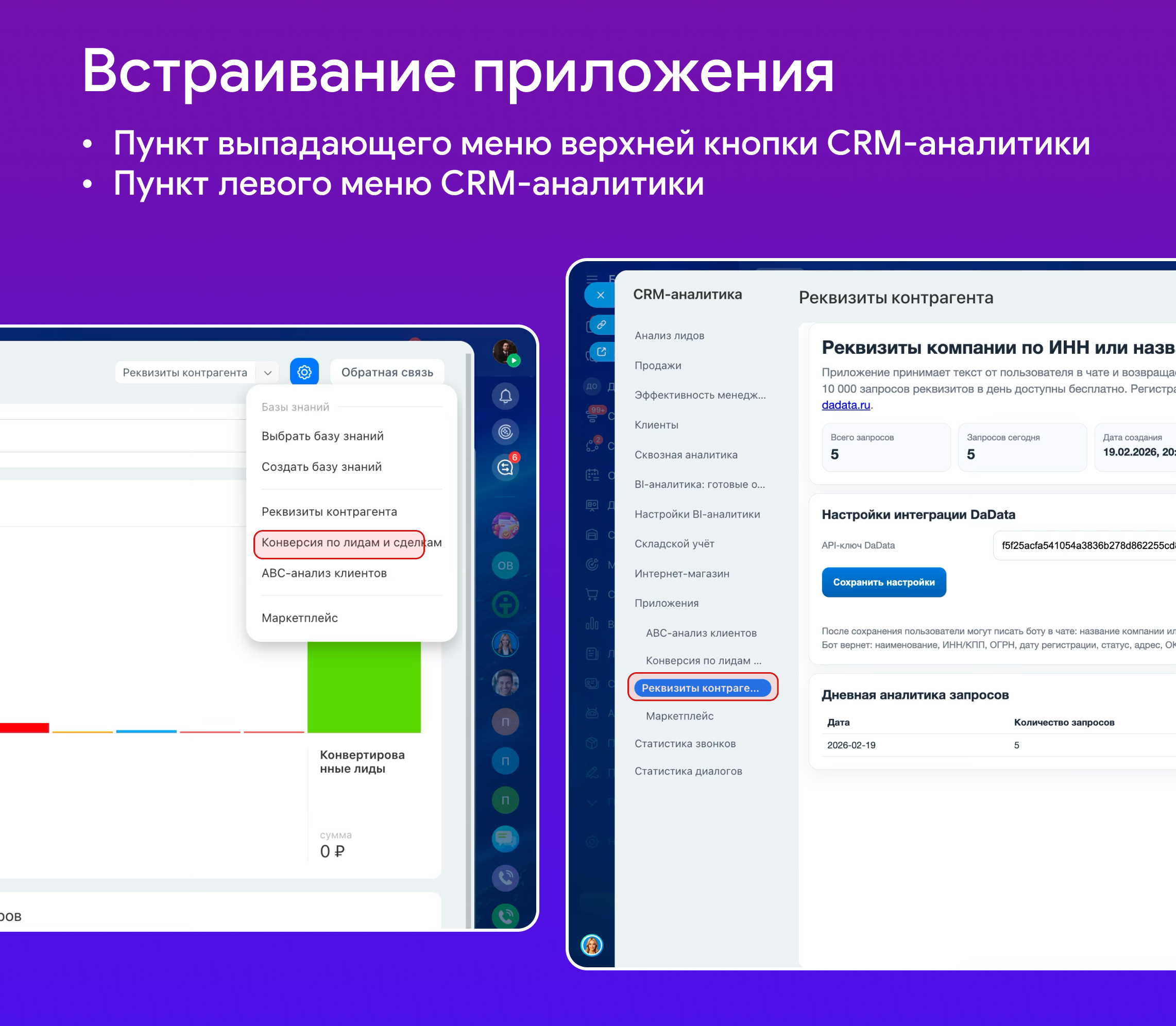 - Контроль использования через встроенную аналитику (общее число запросов, запросы за день, последний запрос и дата создания настройки).