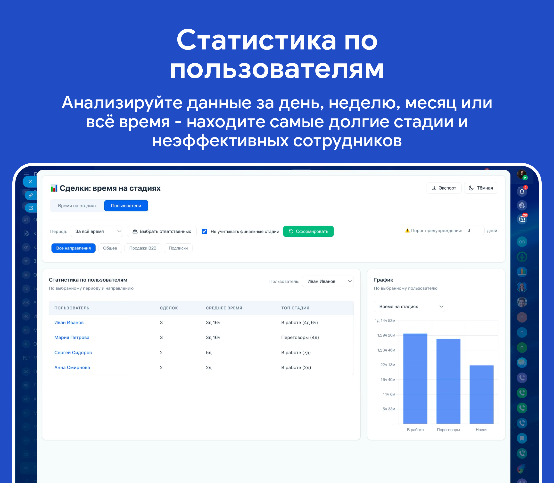 - Автоматическое определение «застрявших» сделок по настраиваемому порогу (количество дней)