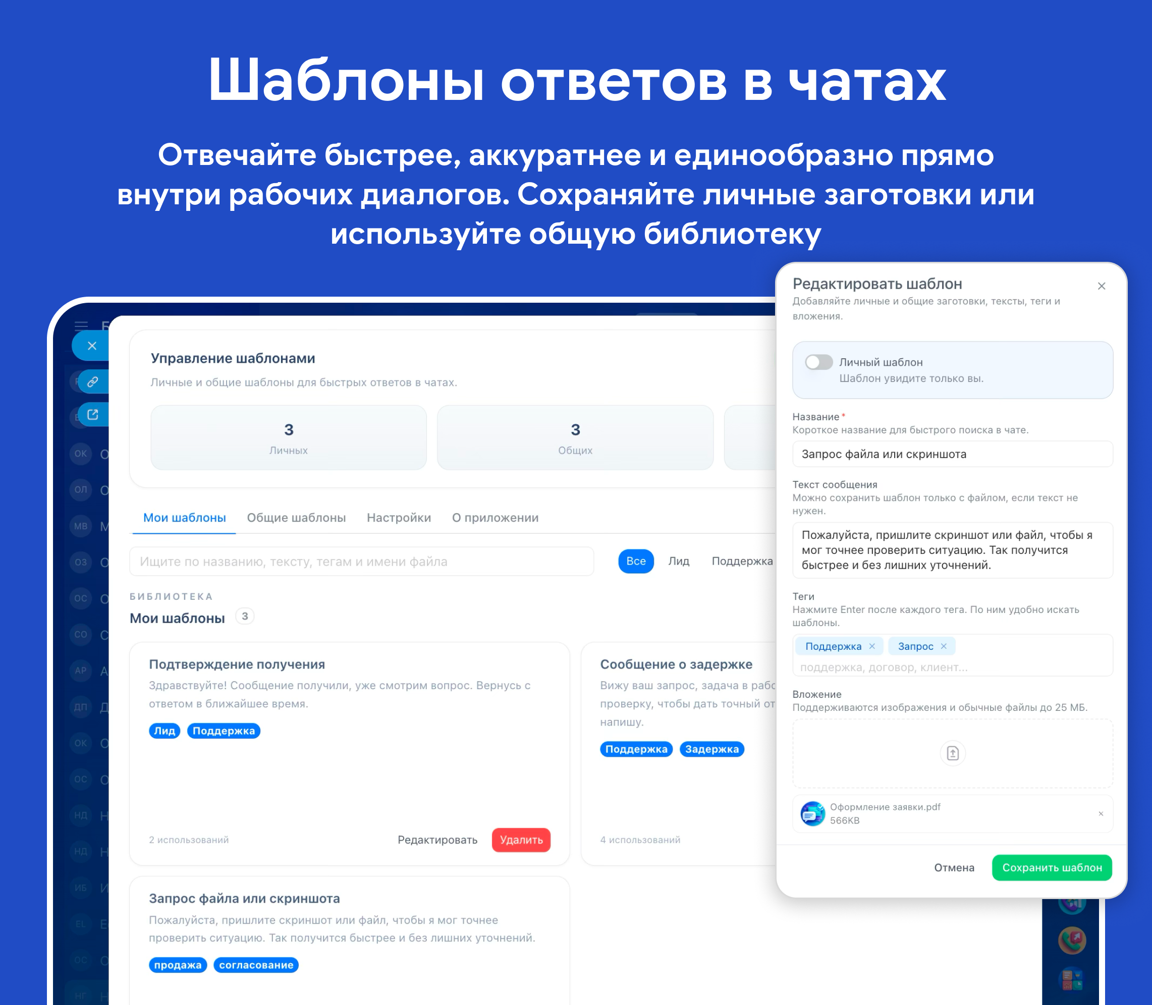 Шаблоны ответов в чатах помогают отвечать быстрее, аккуратнее и единообразно прямо внутри рабочих диалогов. Сохраняйте личные заготовки, используйте общую библиотеку команды и отправляйте готовые ответы с файлами в один клик.
