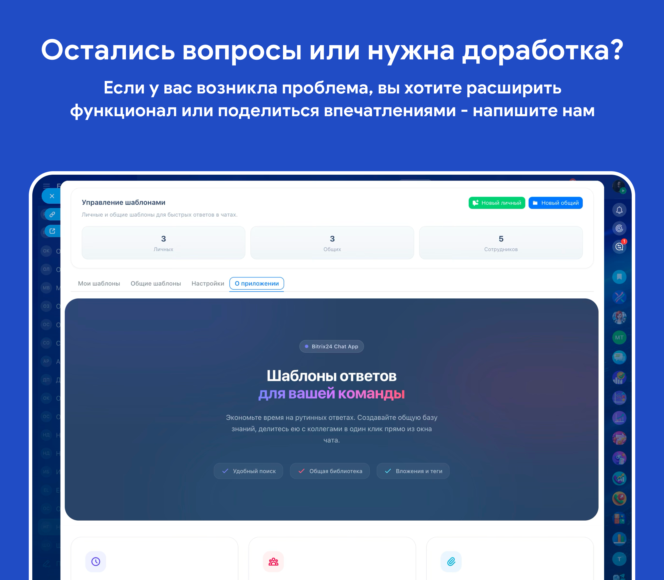 Приложение предназначено для ускорения переписки в рабочих чатах. Оно встраивается в интерфейс чата и позволяет выбирать готовые шаблоны ответов, редактировать текст перед отправкой, сразу отправлять сообщение в диалог и сохранять новые удачные формулировки в личную библиотеку.