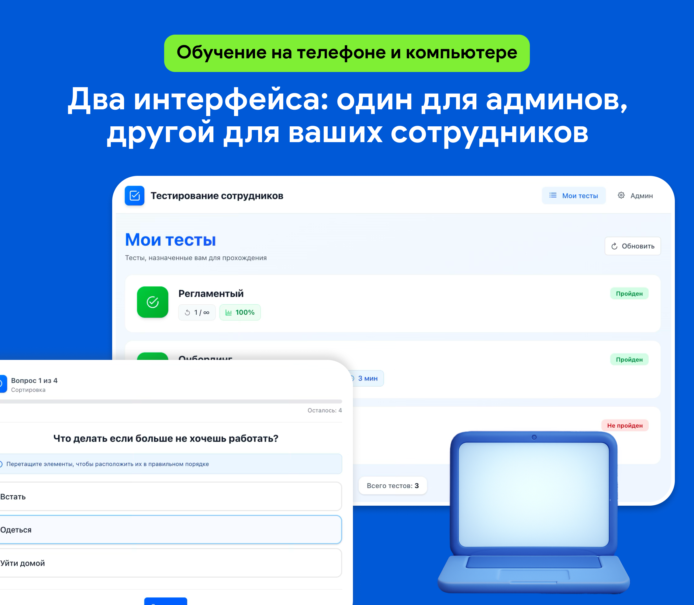 Приложение полностью адаптировано для мобильных устройств. Сотрудники могут проходить тестирование в любом месте и с любого устройства.