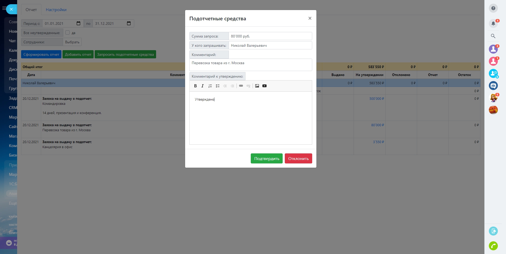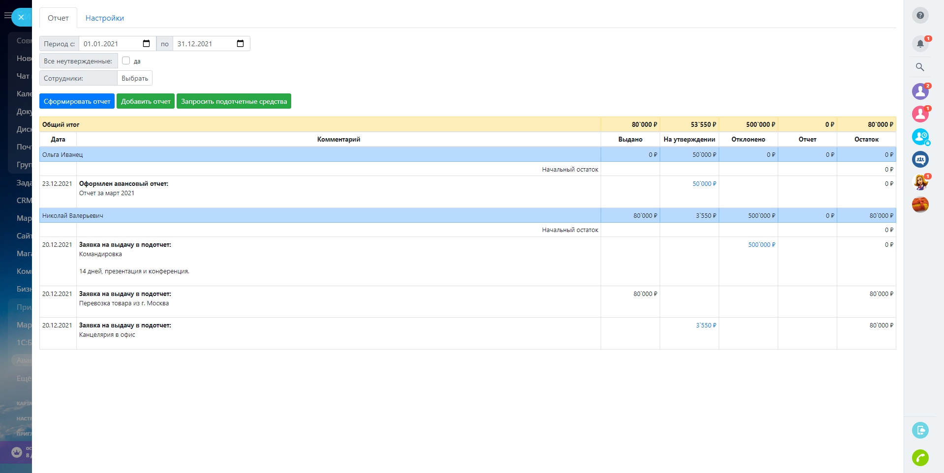 Отчет строится с группировкой по сотруднику. Доступны фильтры по сотруднику, дате создания и статусу не утвержденные.