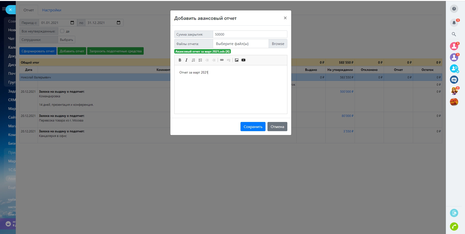 В окне создания авансового отчета можно указать сумму закрытия, оставить комментарий/описание и приложить файлы.