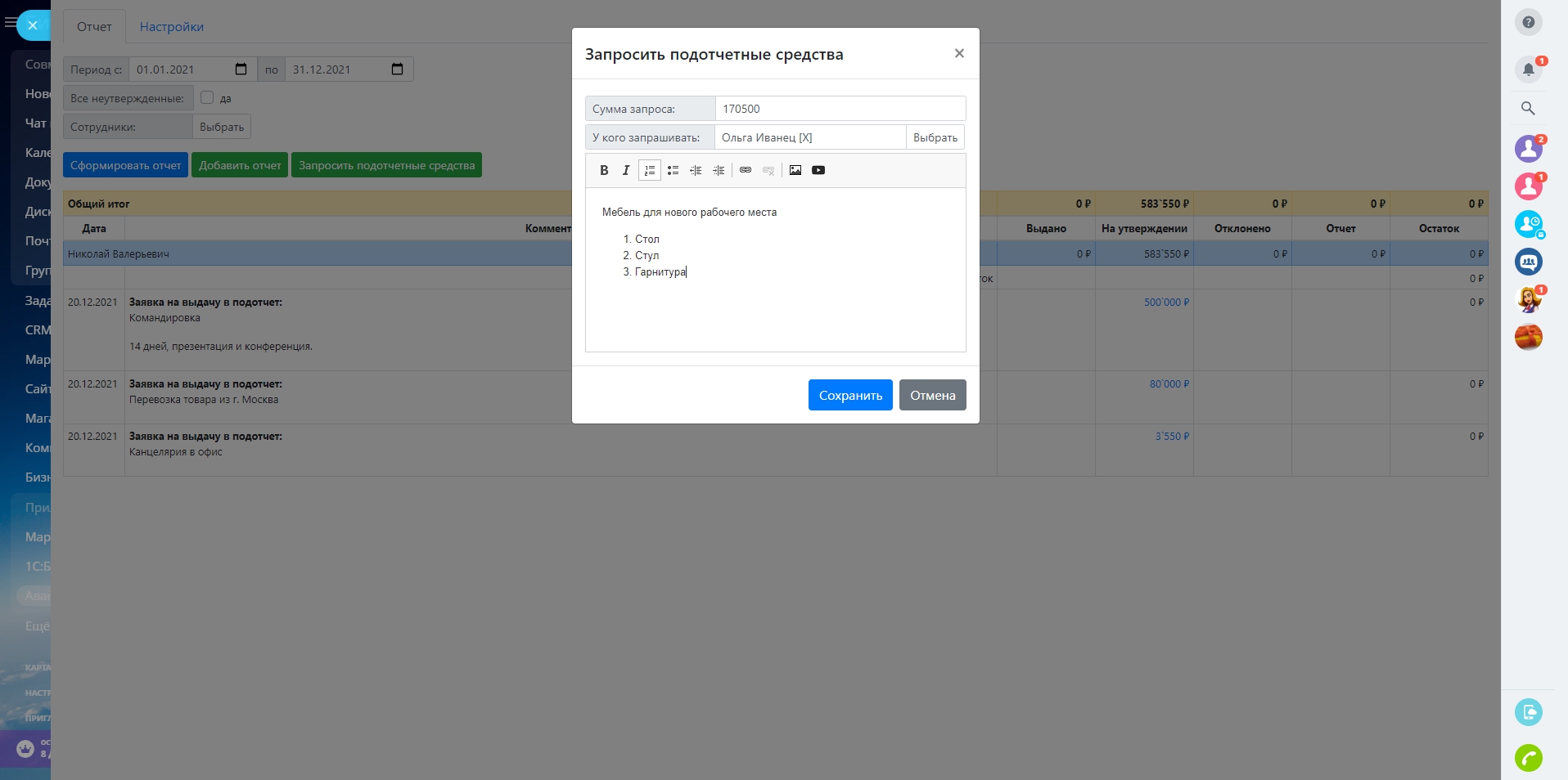 В окне создания запроса можно указать сумму запроса, сотрудника (у кого запрашивать) и описание.