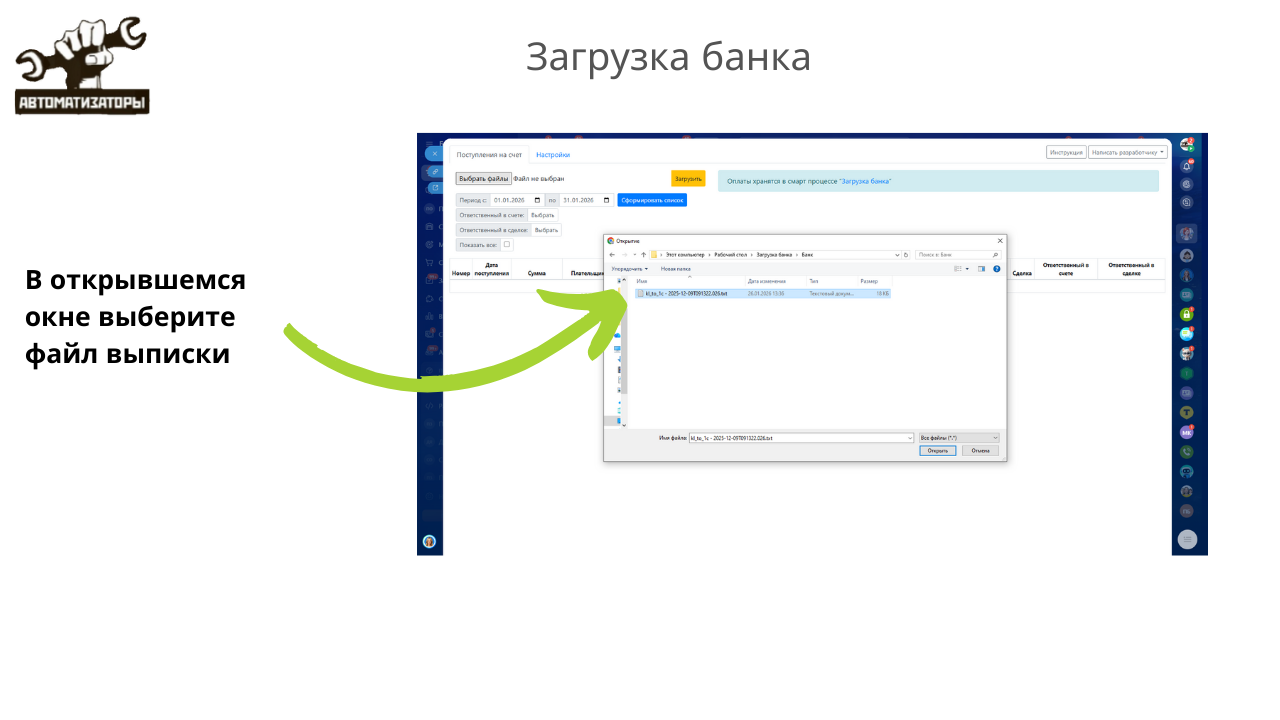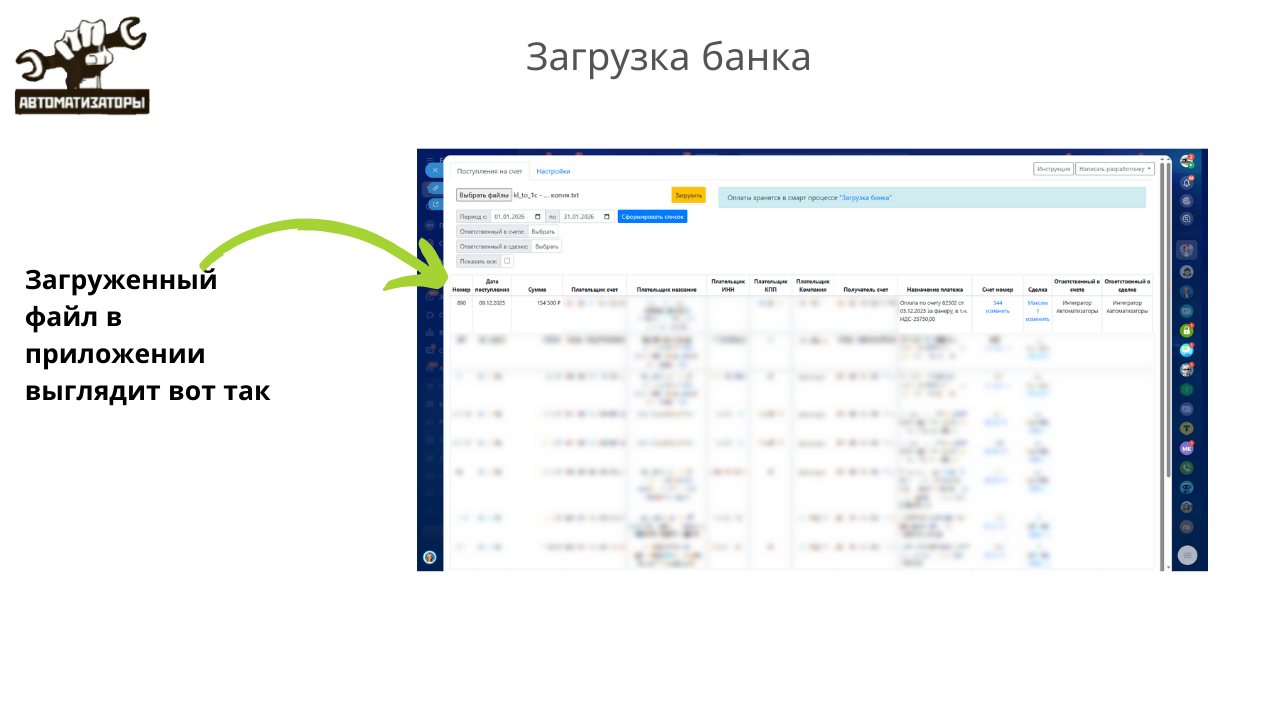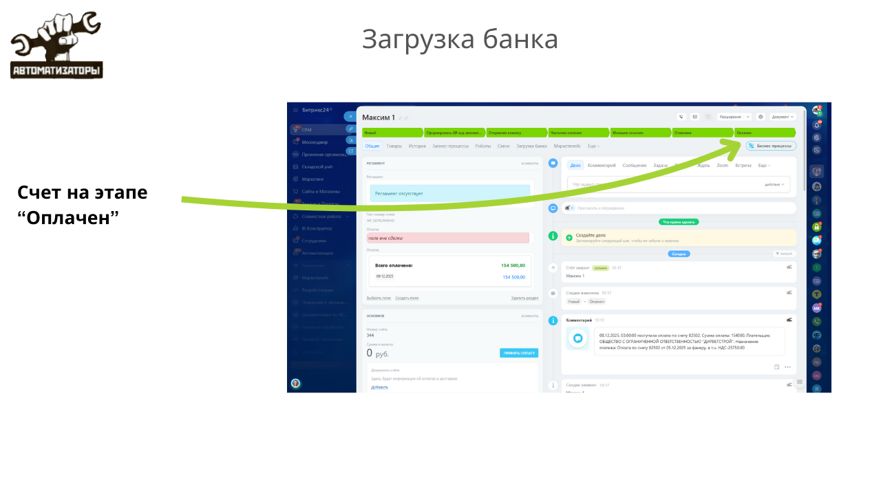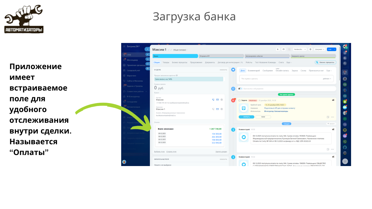 Автоматическое распознавание и связывание: Находит компанию по ИНН + КПП, счёт — по номеру в назначении платежа, сделку — через найденный счёт. Всё без ручного ввода;