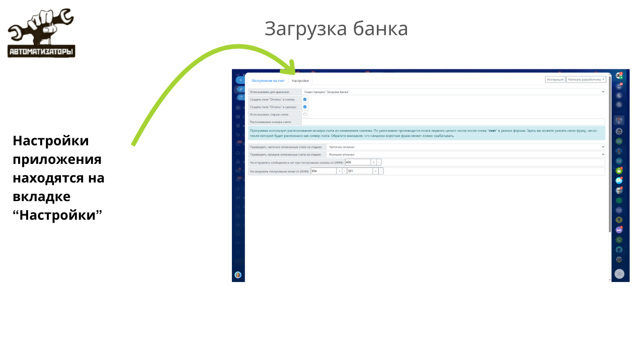 Мгновенные обновления: Автоматически устанавливает статус найденным счетам. При полной оплате переводит сделку на стадию успеха. Поддерживает частичную и избыточную оплату с переводом на заданные стадии (настраивается);