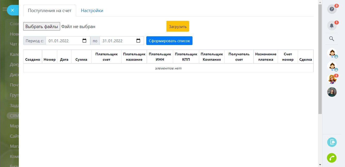 Если документы загрузились, но без связи с Счетом, проверьте, что в CRM есть счет с таким же номером, как и в назначении платежа.