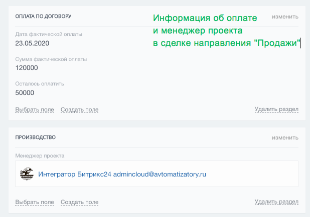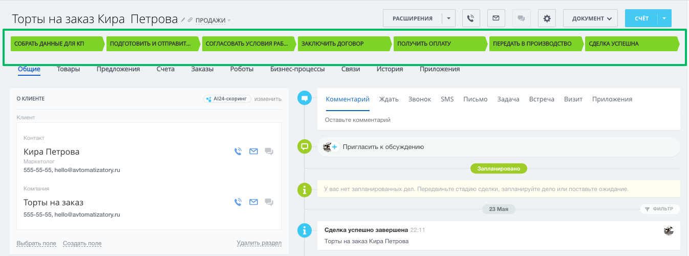 - с автоматической сменой стадий в зависимости от даты запланированного платежа