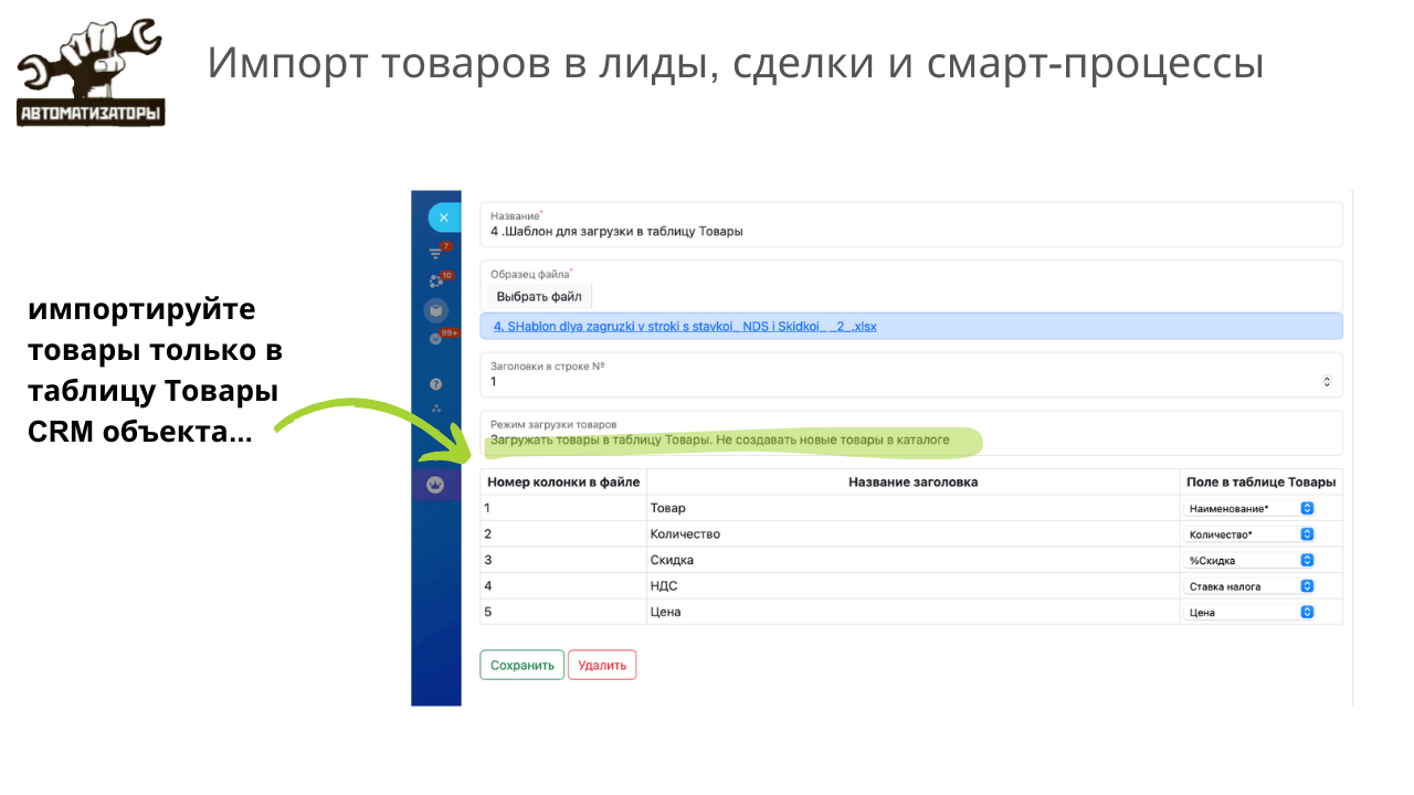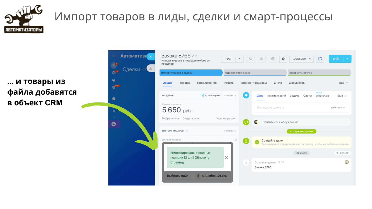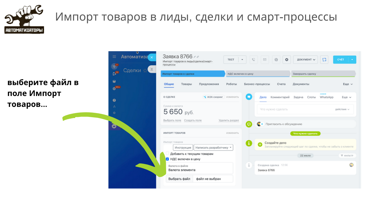 В карточке объекта CRM появляется поле “Импорт товаров”.