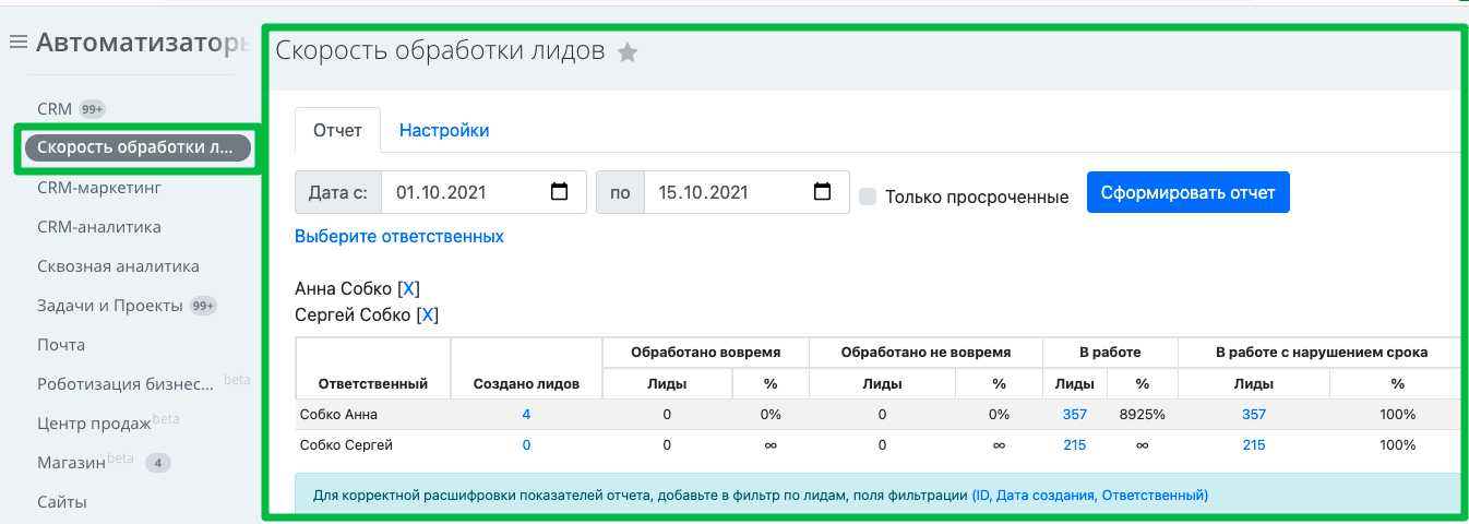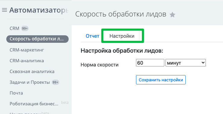 Для того, чтобы увидеть отчет о скорости обработки лидов , перейдите на страницу приложения в раздел "Отчет"