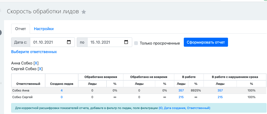 использовать отчет, показывающий сколько лидов обработано вовремя, а сколько с нарушением сроков