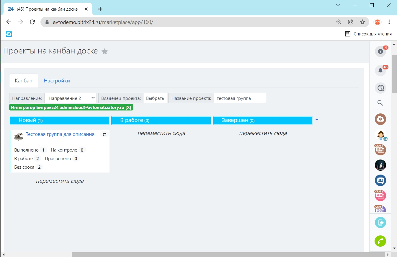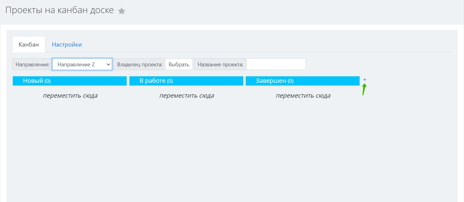 После того, как вы создали направление, перейдите в раздел канбан и выберите созданное направление. В любом направлении можно добавлять и удалять стадии аналогично, как и в представлении канбан сущностей лидов и сделок:
