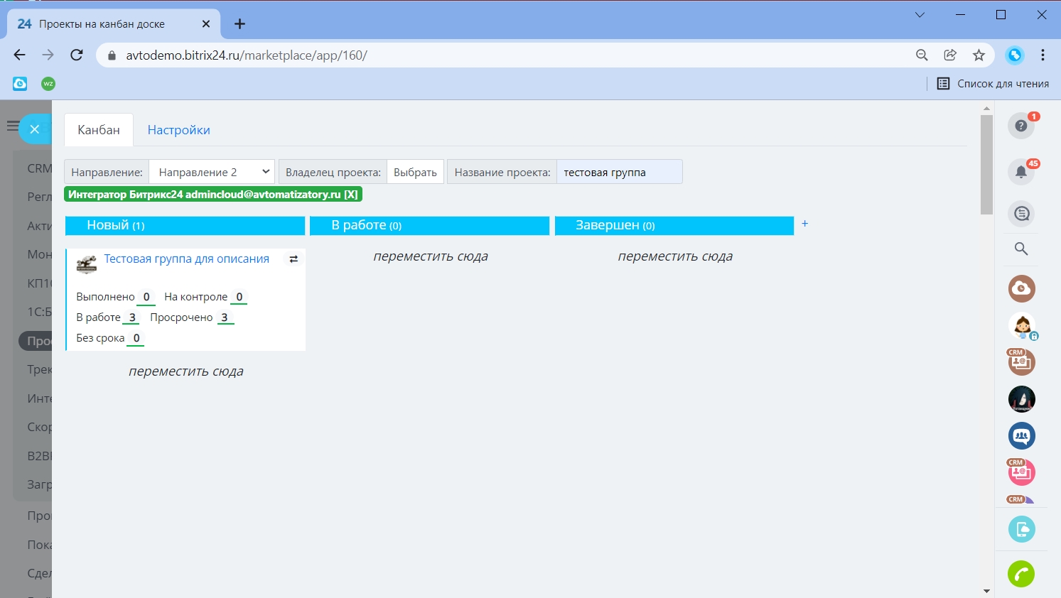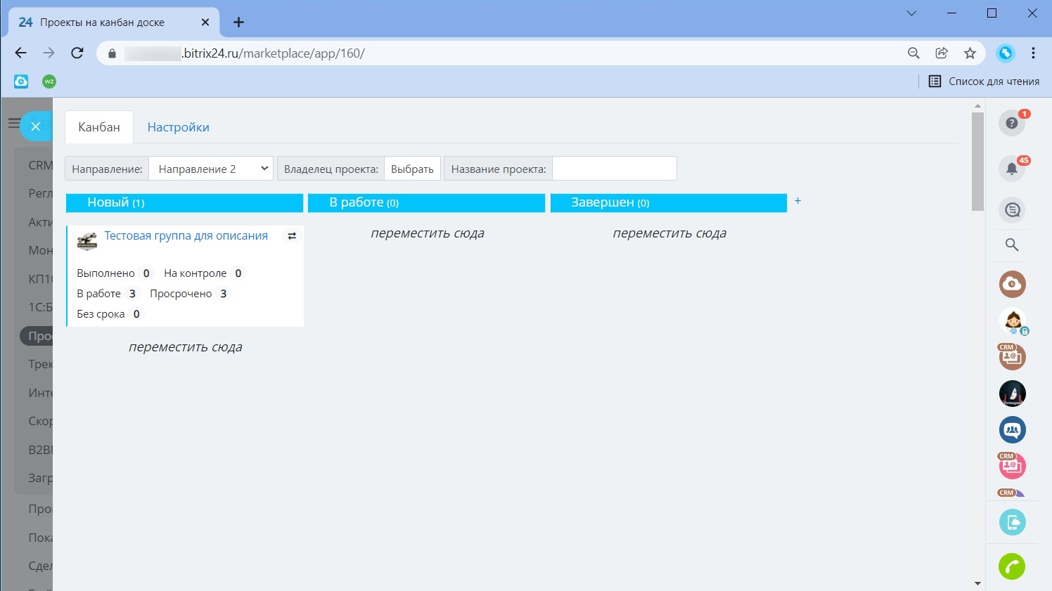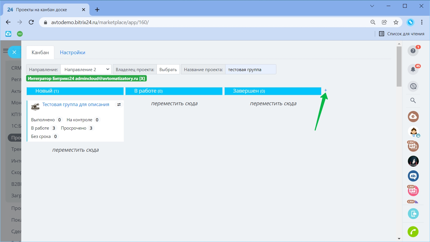 После того, как вы создали направление, перейдите в раздел канбан и выберите созданное направление. В любом направлении можно добавлять и удалять стадии аналогично, как и в представлении канбан сущностей лидов и сделок: