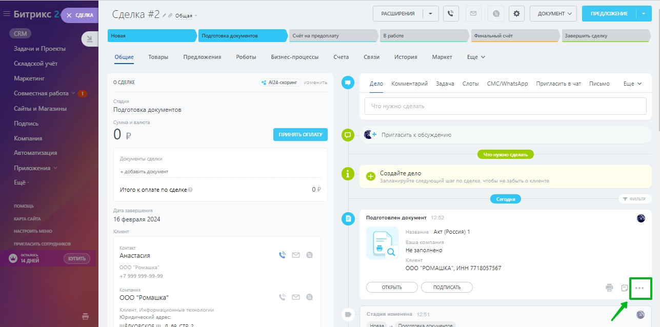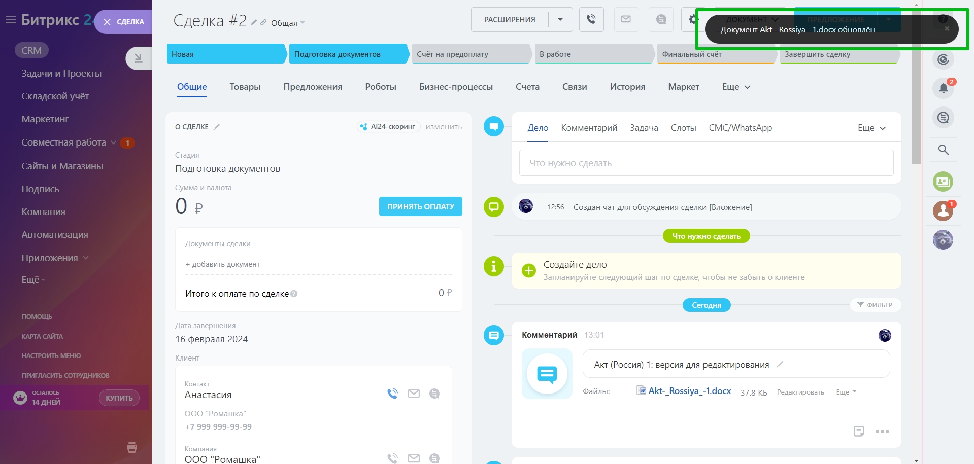 Теперь вы можете сделать это в один клик с помощью приложения “Редактирование документов”, которое сохраняет документ в таймлайн сделки, делая доступным его редактирование непосредственно в Битрикс24.